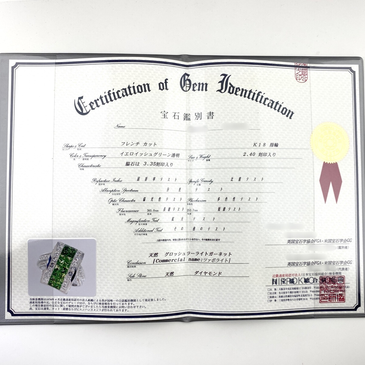 | グリーングロッシュラーガーネット:2.40ct、メレダイヤ:3.35ct 中古品の為、若干のキズや汚れがございます。 |