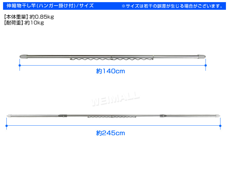 コンパクトで持ち運びに便利な物干し竿です。 ハンガーに掛けた洗濯物が風で移動せず、間隔を保って干せる便利なハンガー掛付きです。 両端が伸縮するので、短く使う時でもバランスの取れた形になります。 錆びにくいステンレス被覆鋼管を使用しています。 【商品仕様】 商品サイズ(約):長さ140~245mm×直径25mm 耐荷重(約):10kg ハンガー数:14カ所(ハンガー掛け付きのみ) 材質:ステンレス、ABS樹脂 他 【商品仕様】 伸縮物干し竿 ×1 |