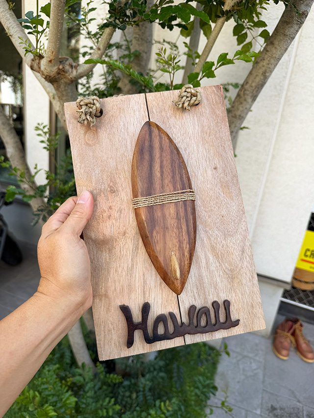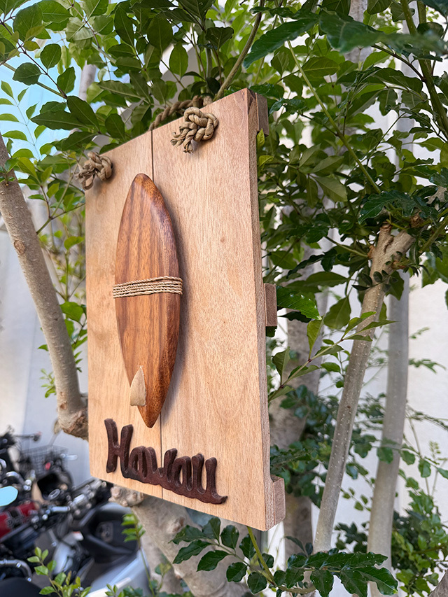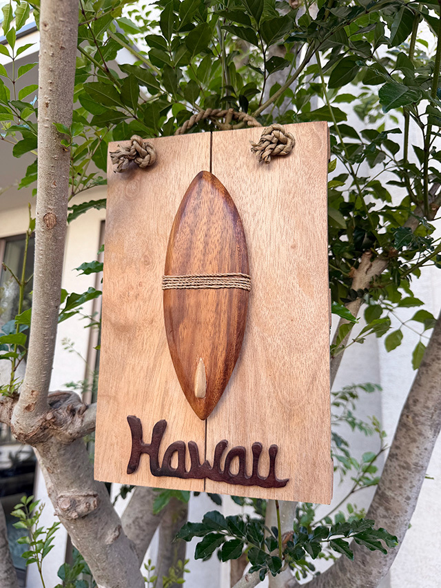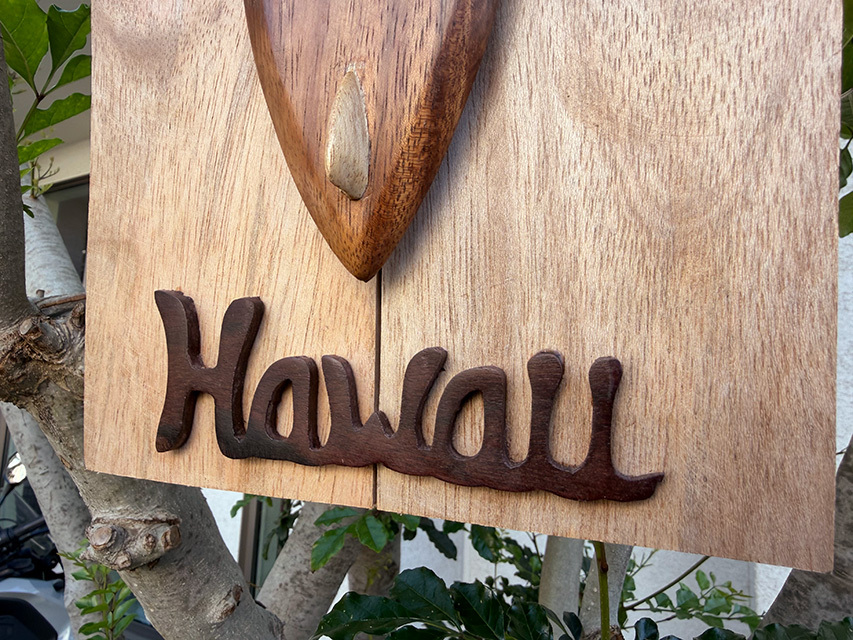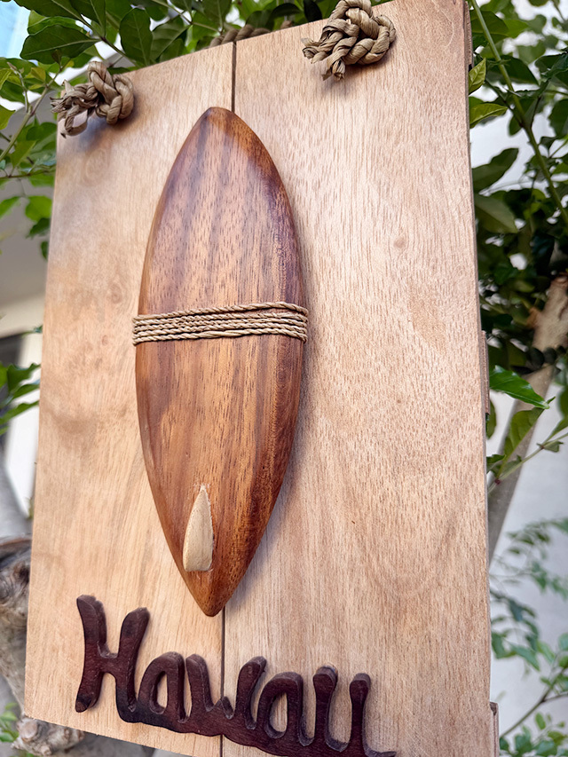 ハンドクラフトで仕上げられた木彫りのサーフボードと、ゆるく波打つような“Hawaii”のロゴ・・・・