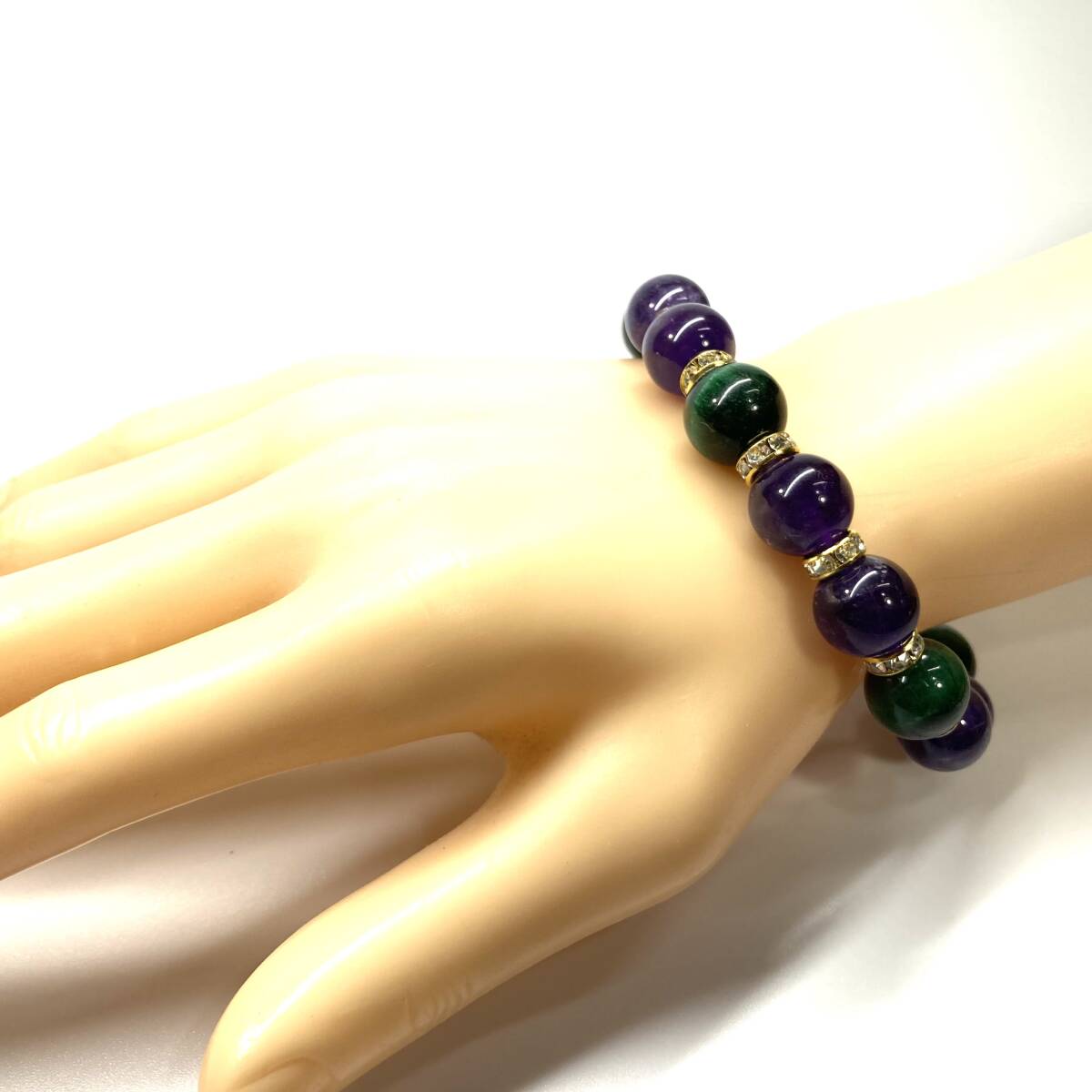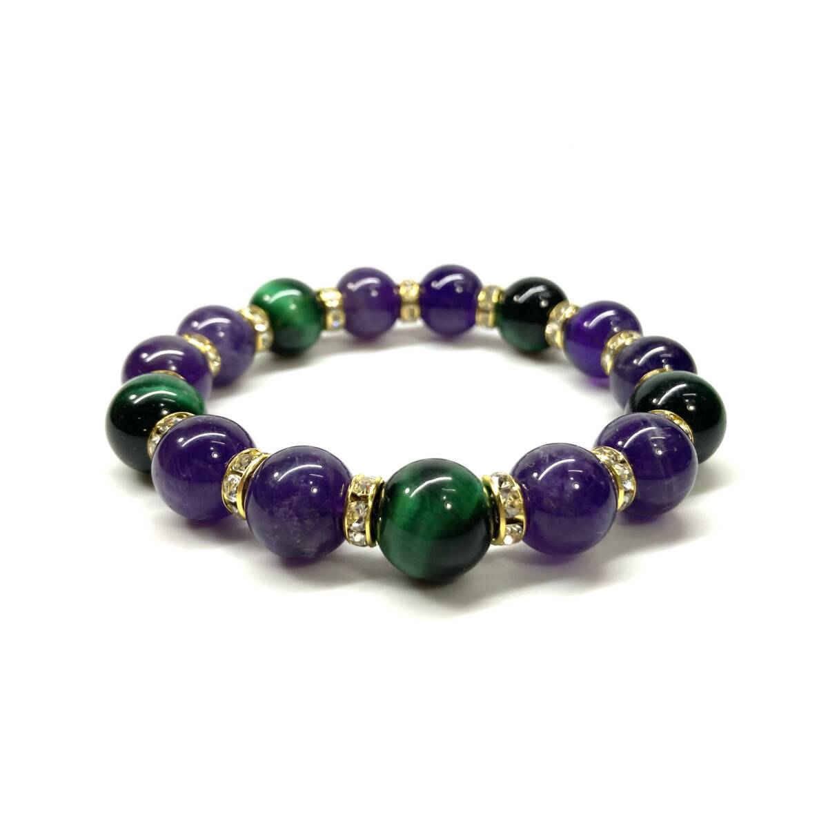 こちらは、グリーンタイガーアイとアメジストを組み合わせたパワーストーンブレスレットです。間にはロンデルを挟み高級感あるデザインに仕上げております。石大きさは12mm玉を使用して内周約18cmです。気になる方は是非この機会にどうぞ。