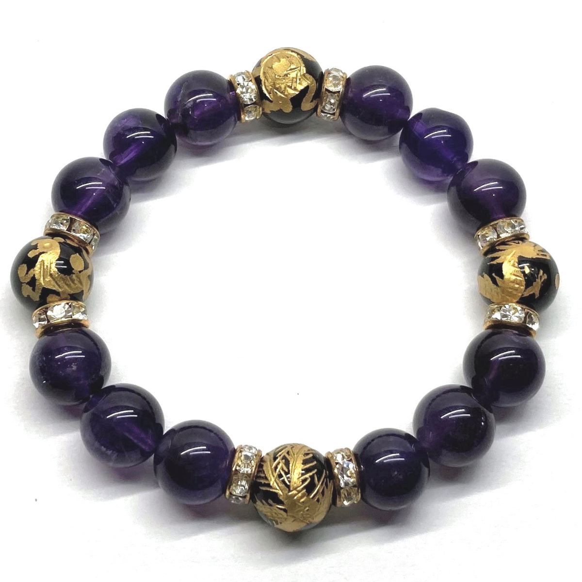 こちらは、四神獣金彫オニキとアメジストを組み合わせたパワーストーンブレスレットです。四神獣は、中国の伝説で4つの方向(東西南北)を守護する神聖な神。四神獣、厄災から身を守り、多くの運気を呼び込むと言われております。石大きさは程よくインパクトのある12mm玉で内周 約17cmです。 数に限りがございますので気になる方はお早めにどうぞ。