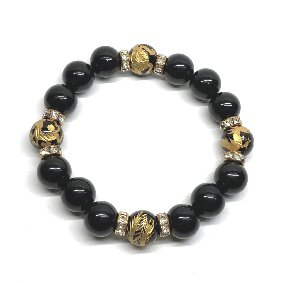 こちらは、四神獣金彫オニキとオニキスを組み合わせたパワーストーンブレスレットです。四神獣は、中国の伝説で4つの方向(東西南北)を守護する神聖な神。四神獣、厄災から身を守り、多くの運気を呼び込むと言われております。石大きさは程よくインパクトのある12mm玉で内周 約17cmです。 数に限りがございますので気になる方はお早めにどうぞ。