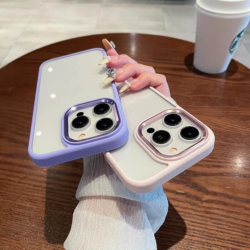 ツートンカラー:フレームと透明背面の配色でお洒落、ボタンとカメラの枠はメタルカラーで可愛い。
