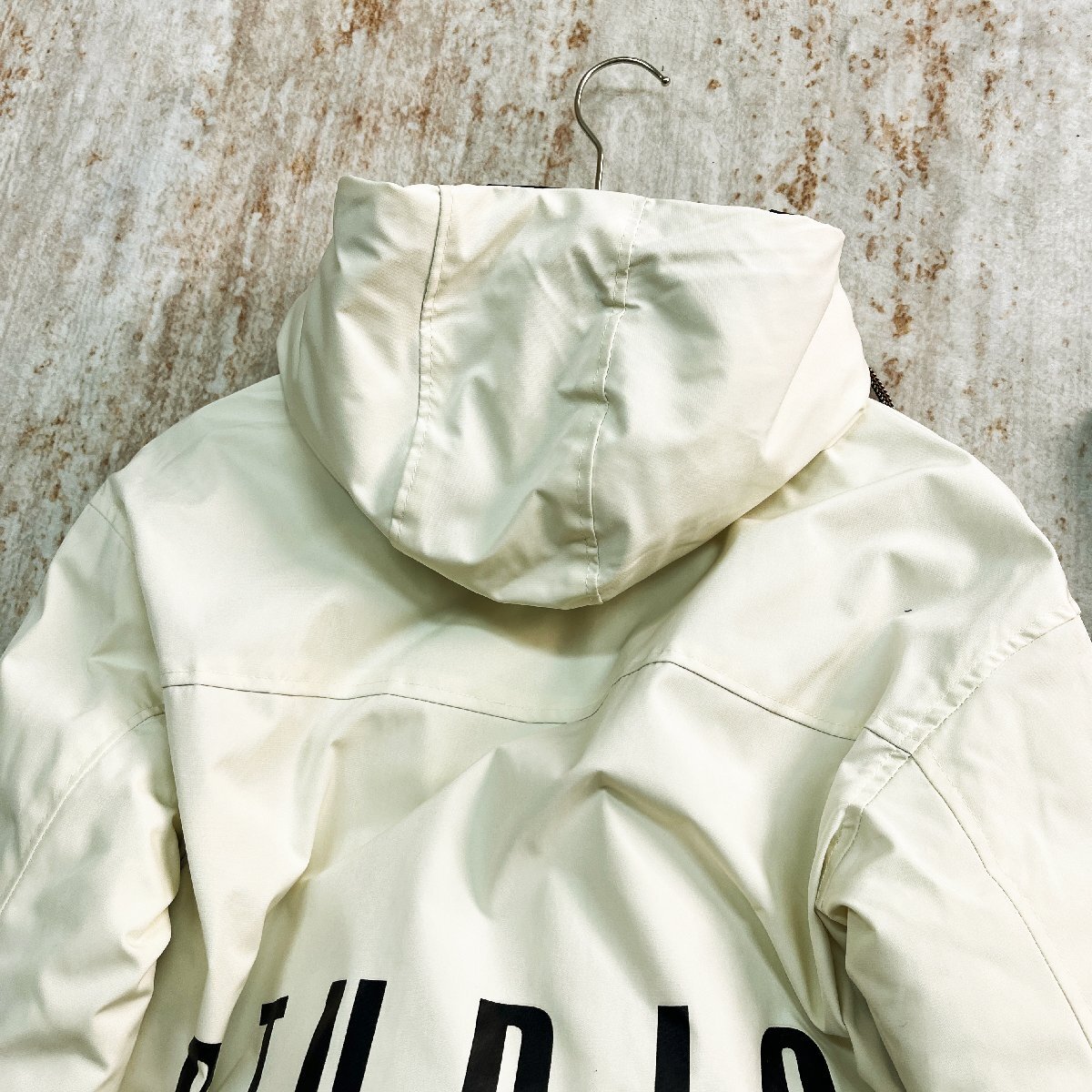 背中には目を引く英字プリントが施され、シンプルながらも存在感のあるデザインに仕上がっています。フードは紐でサイズ感を調整できるので、だから寒い時には防寒対策としてフードの紐を引き締めるておくことで暖かさを保つことができます。袖口には調整可能なマジックテープと伸縮性のあるゴムが施されており、風の侵入を防ぎながらぴったりとフィットさせることができます。フロントには3つポケットが付いており、インナーポケットも備えており、スマートフォンや鍵などの小物を収納のに便利です。