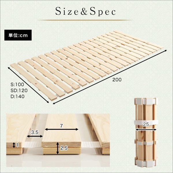 | 【ポイント】 通気性バツグンのすのこベッドです。 材質はすのこベッドにおける最良の檜材を使用しました。 頑丈な耐荷重180kgです。 丸めて簡単折りたたみタイプです。 |