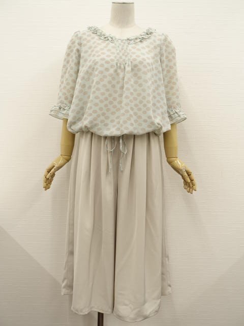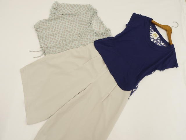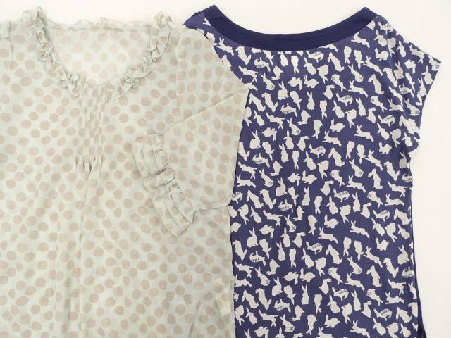 洗える半袖カットソー+七分袖シフォンプルオーバーブラウス+スカーチョ コーディネート上下3点セット M相当 ネイビー&ネイビー地 ホワイト うさぎ柄/サックス地 グレー ドット柄/グレージュ カジュアル系 20代・30代~