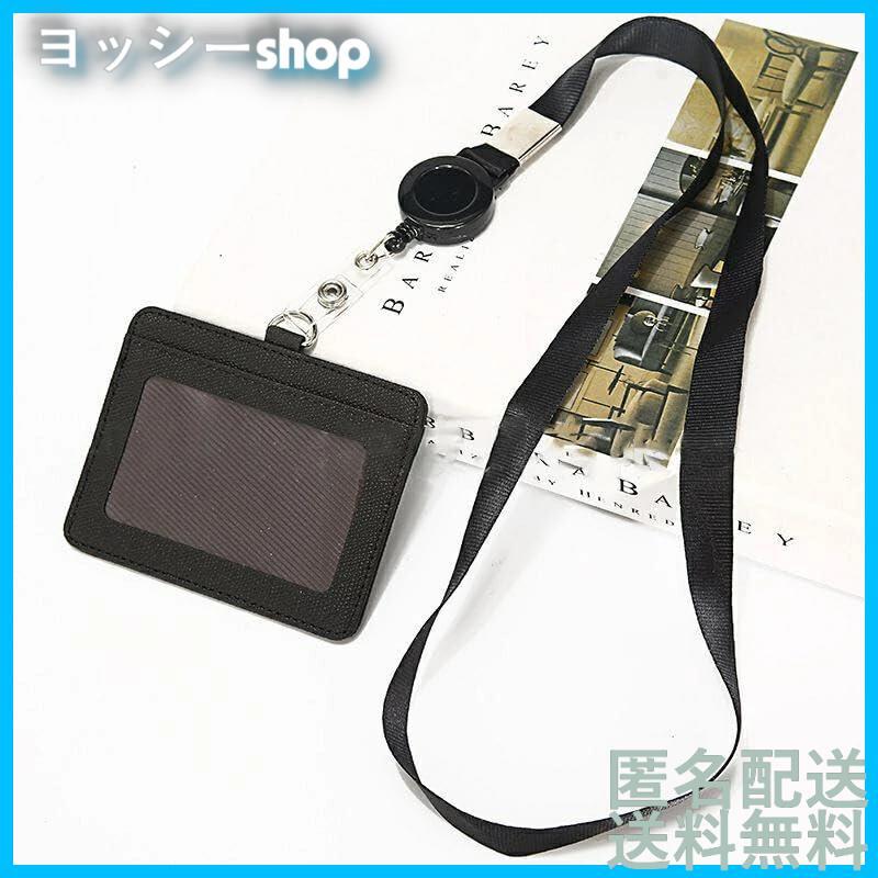 [エアステリア] パスケース リール付き 首掛け ネック ストラップ 薄型 横型 伸縮 PUレザー 定期入れ カードホルダー 社員証 名札 ICカード IDカード カードケース シンプル メンズ レディース 通勤 通学 (ブラック)