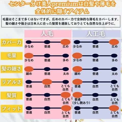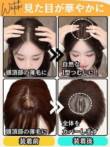 【極自然なI型つむじ】A特徴:【センター分け美人premium+】はつむじや頭頂部周りの薄毛や生え際の白髪にお悩みの、ウィッグ、付け毛、カツラ初心者に最適の商品。植毛方法にもこだわり、二重構造&引き抜き式を採用。人毛様耐熱ファイバーの為、ヘアアイロン、ヘアカット、シャンプーも使用可