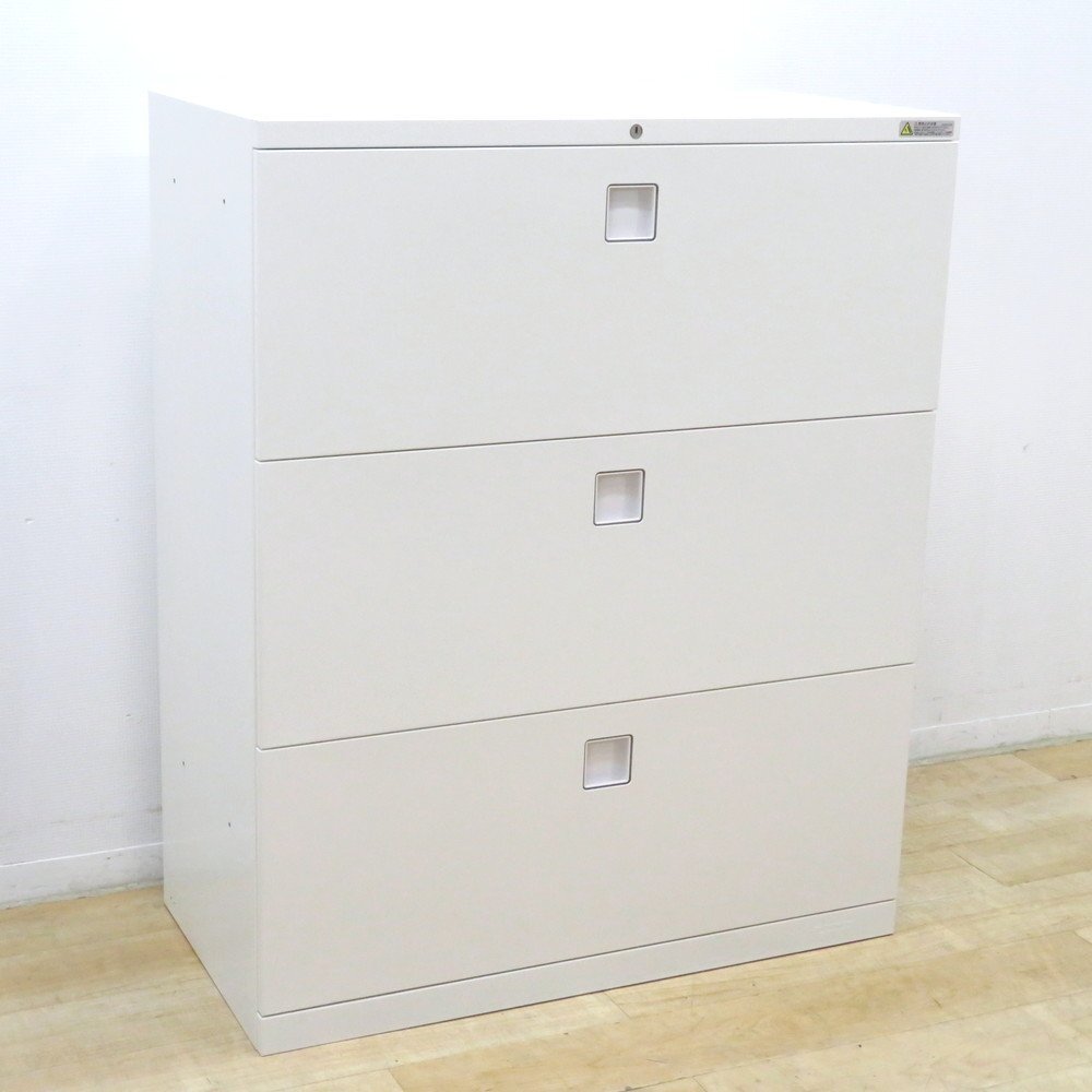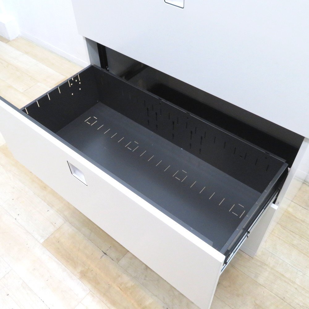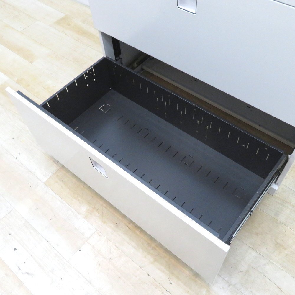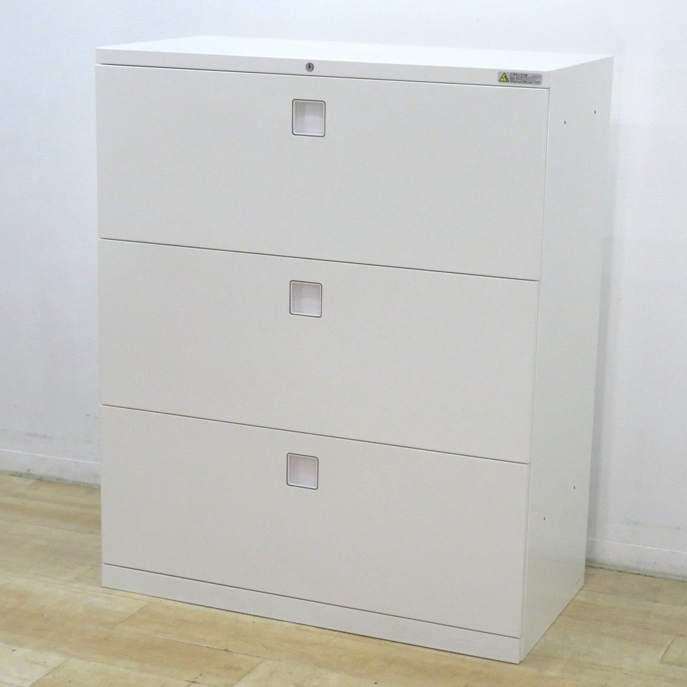 オカムラの人気シリーズ レクトラインの3段ラテラル書庫が入荷いたしました。 無駄を省いたシンプルなデザインが人気のレクトライン。 A4ファイルを立てて大量に収納できる引き出し式の3段書庫は書類保管に最適です。 ラッチ構造で災害時も引き出しが飛び出すことがなく、安心してお使いいただけます。 清涼感あふれるオールホワイトとレクトラインの象徴ともいえるマルチハンドル。 機能性とデザイン性を融合したまさに高機能オフィス収納庫です。 |