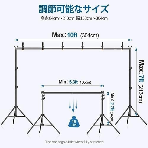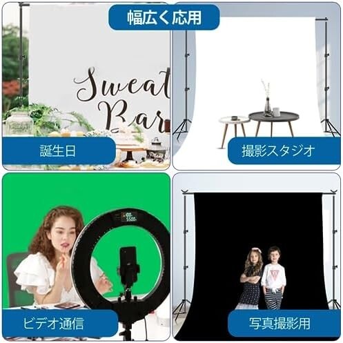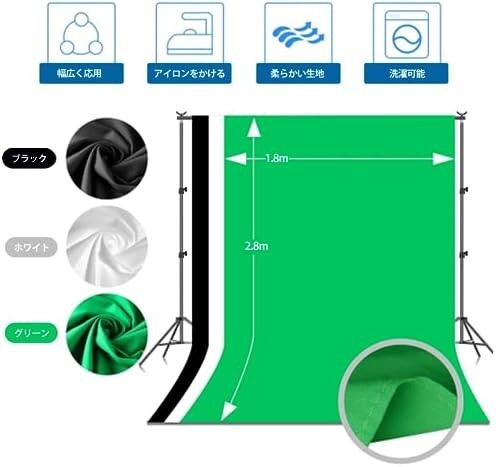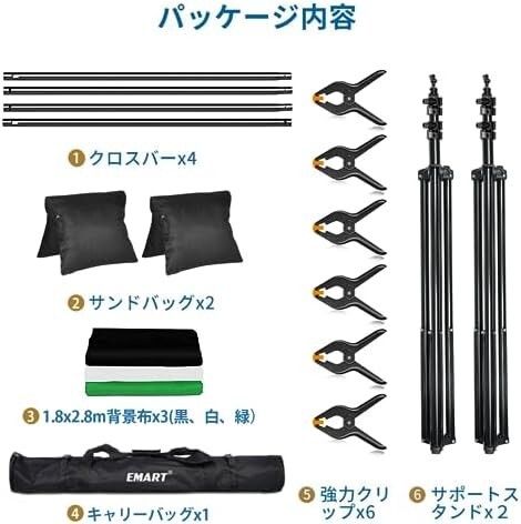 【背景スタンドセット内容】200x300cm撮影背景スタンドx1(クロスバーx4、三脚x2)、180x280cm 黒背景布 x1、白背景布 x1、緑背景布 x1、強力スプリングクランプx6、サンドバッグ x2、キャリーバッグx1