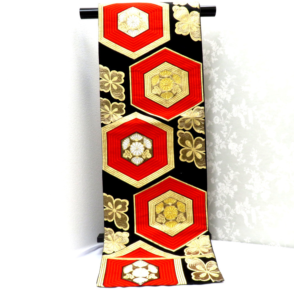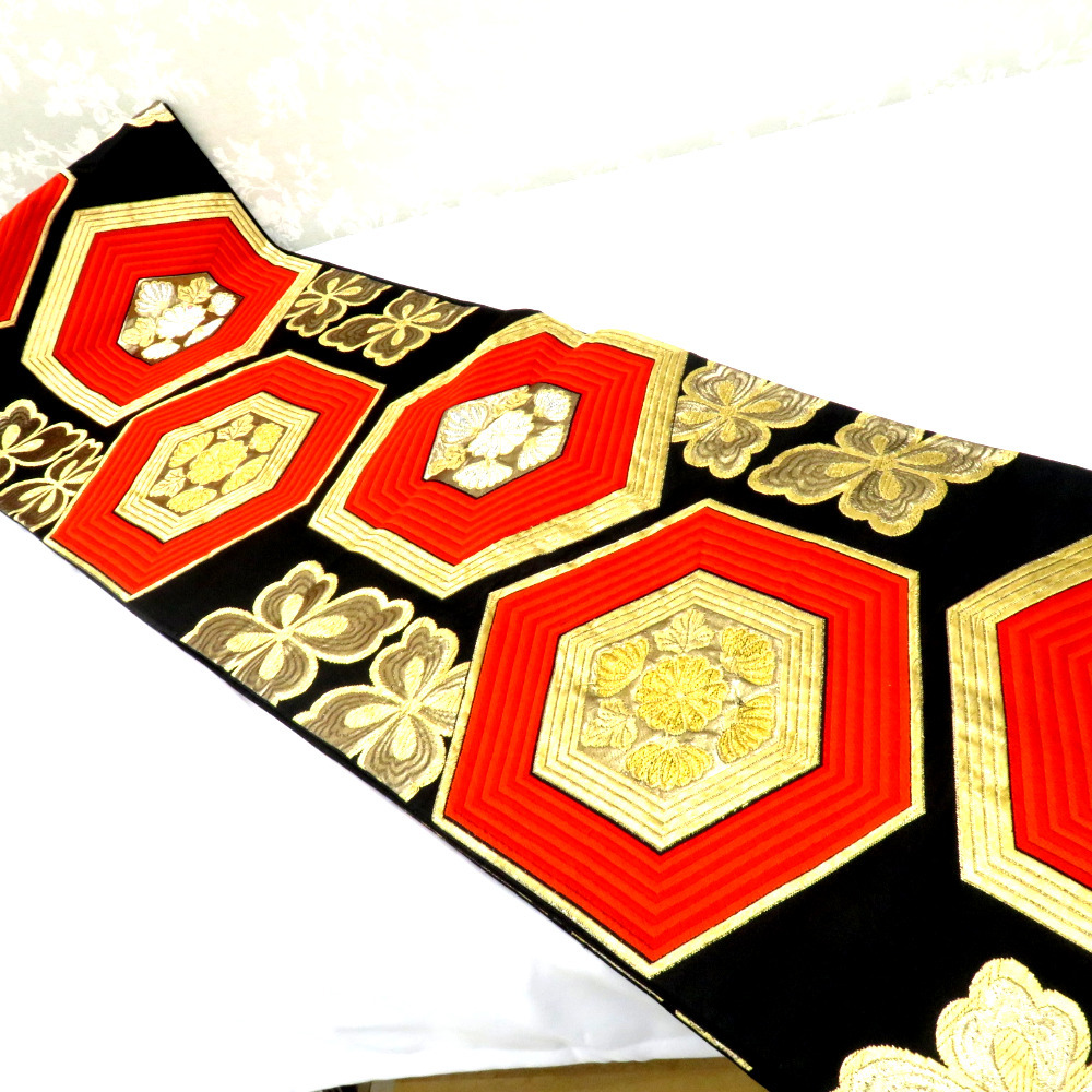 | 袋帯 黒 金 赤 銀 亀甲 花 六通柄 正絹 仕立て上がり フォーマル 長さ409.5cm |