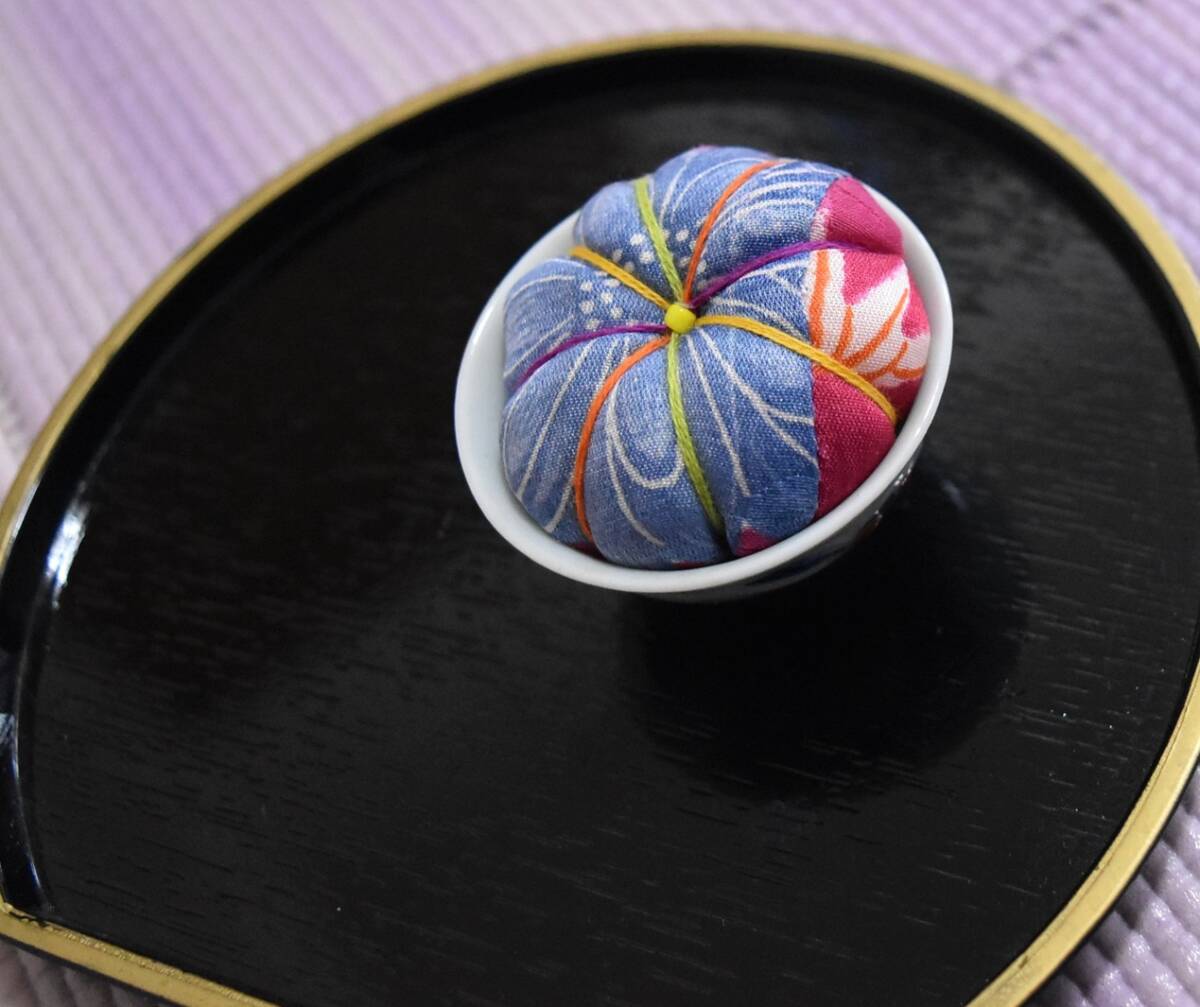 和☆着物リメイク 古布と印判湯のみがかわいい針刺し 生活骨董 ピンクッション 湯呑 141