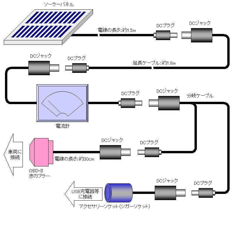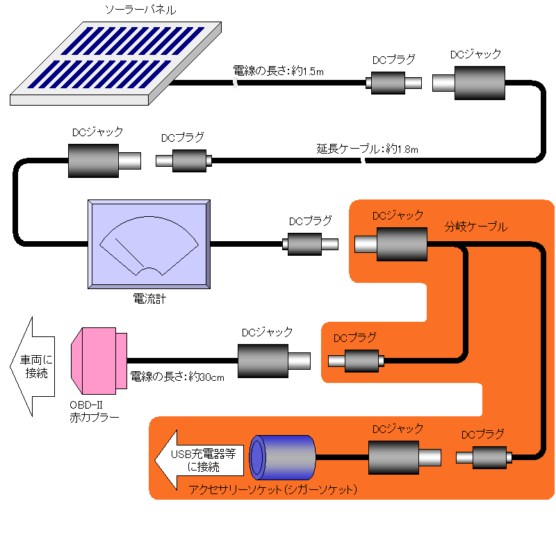 プラグイン・ソーラーチャージャーと車両のOBDコネクタの間に分岐を介して接続することにより、