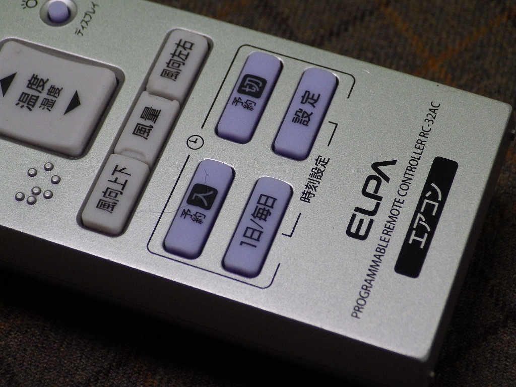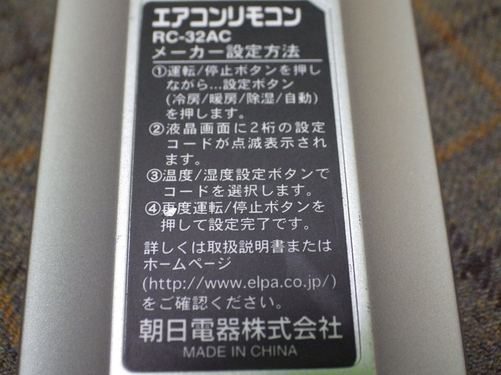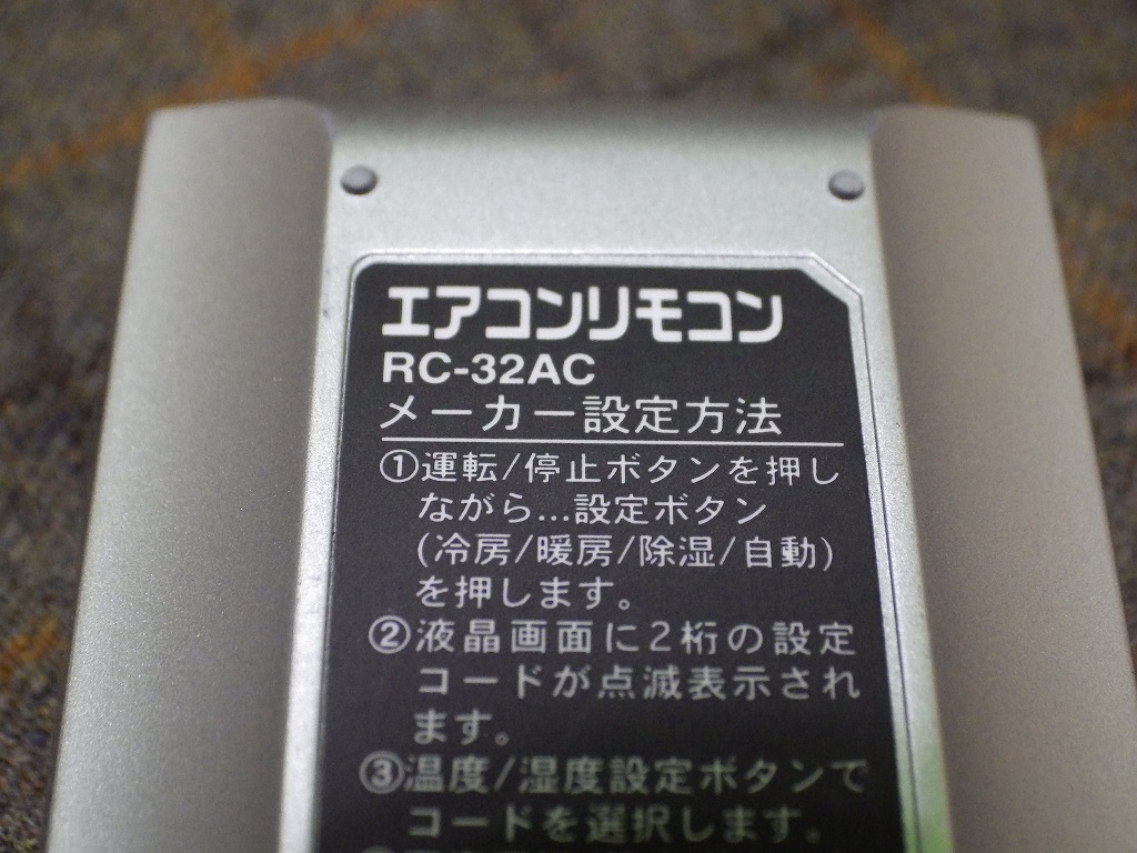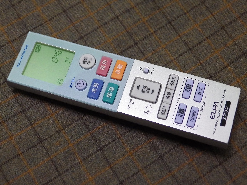 | ELPA プログラムタイマー付エアコンリモコン RC-32AC 汎用タイプ 国内メーカー13社対応 動作品の出品です。 中古 通電確認 OK 単四乾電池2本で駆動。 液晶表示正常。 発信部赤外線出力 確認済み。 ※全ボタンは未確認。 さらに多くの画像をご確認できます。こちらをご覧ください 取説書はこちらよりご確認できます。 【商品特長】 エアコンの主な操作が可能 好きな時間に自動でON/OFFできる24時間プログラムタイマー機能付 国内主要メーカー13社対応 傾斜角5°で自立できるから省スペース、表示が見やすい 握りやすく押しやすいユニバーサルデザイン 夜間の操作に便利なディスプレイバックライトボタン付 再設定不要のバックアップ機能搭載 【商品仕様】 動作距離:約7m(使用機器や部屋の条件により異なります) 電 源:DC3V 単四形乾電池 2本(別売) 電池持続時間:約12ヶ月(アルカリ乾電池使用時/バックライトOFF時) ※使用頻度により異なります。 外形寸法(約):幅46mm×高さ175mm×厚さ30mm 質 量:約88g(乾電池除く) 【対応メーカー一覧】 メーカー名エアコン 富士通ゼネラル94年製~ フナイ98年製~ 日立94年製~ 三菱電機(霧が峰)93年製~ 三菱重工(ビーバー)94年製~ Panasonic(National)88年製~ サンヨー96年製~ シャープ97年製~ 東芝94年製~ コロナ99年製~ ダイキン96年製~ LG電子96年製~ 【出品内容】 画像に写っているものが全てです。 ※乾電池は付属しません 使用及び保管に伴う、キズ・汚れ等ございます。 商品の程度・状態は、掲載画像にてご確認下さい。 上記内容を十分ご理解頂いた上でのご入札お願いします。 神経質な方、程度を非常に気にする方はご入札をお控え下さるようお願いします。 お探しの方!この機会にいかがでしょうか? | |