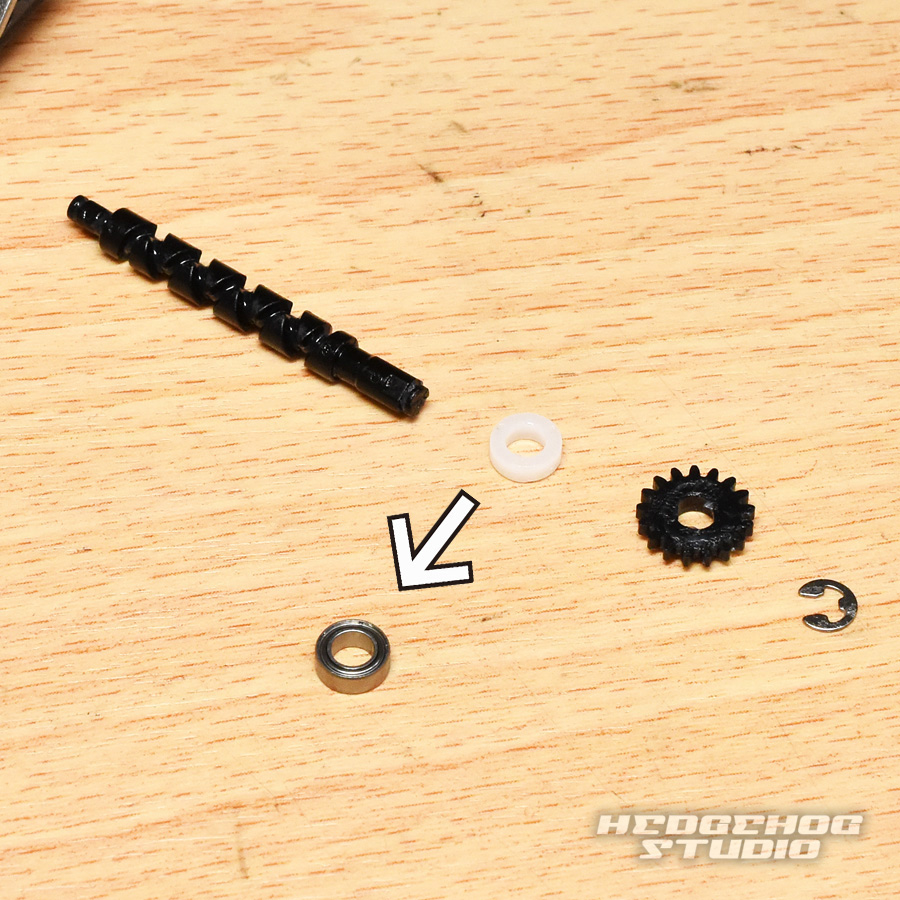 ウォームシャフト部に組み込まれている白いプラスチックカラーをベアリングに交換することで駆動をより軽やかにすることが可能です。
