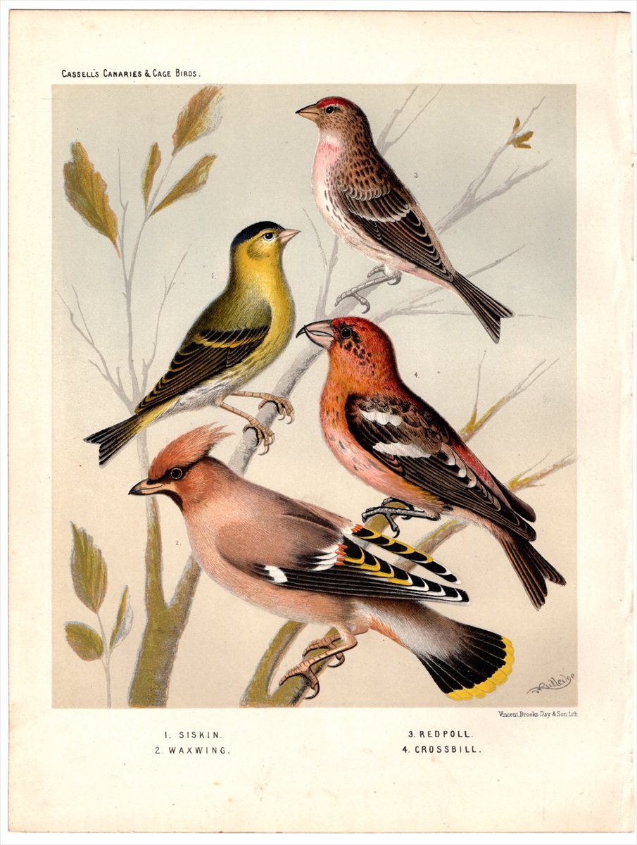1880年 Canaries and Cage Birds 多色石版画 アトリ科 マヒワ ベニヒワ イスカ レンジャク科 キレンジャク 博物画
