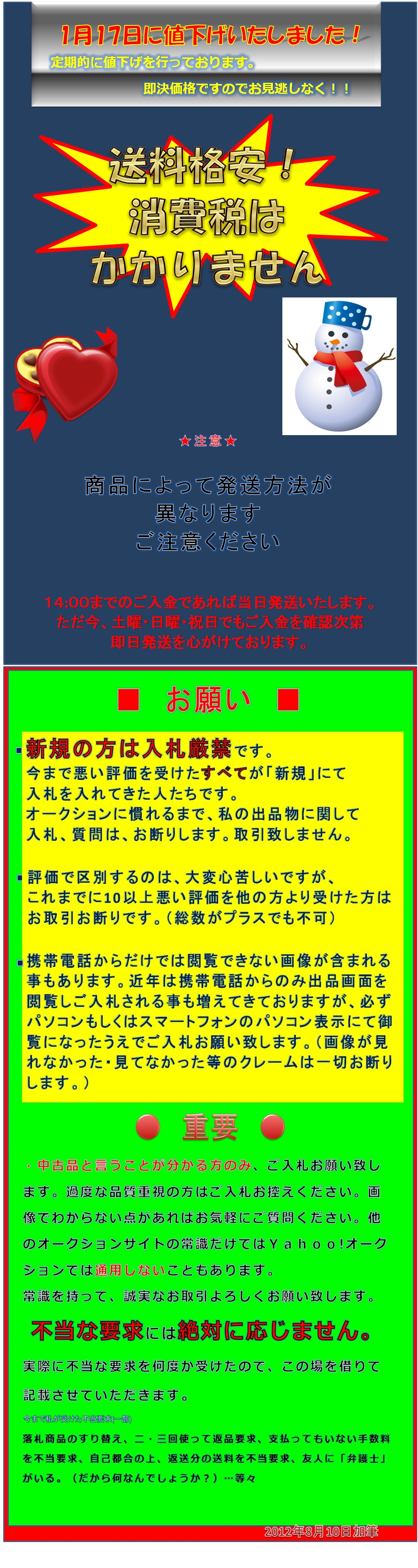 定形外郵便であれば全国どこでも400円にて承ります。差額は当方負担です。 基本的にご入金を確認後の翌日発送となります。 ■■■■ お支払の方法 ■■■■ ・かんたん決済 ■■■■ お知らせ ■■■■ 最近、落札後にご連絡をいただけないケースが増えてきております。 落札時より48時間以内にご連絡がない場合は、 落札者様都合のキャンセルとさせていただきます。 (新規の方・マイナス評価が10以上の方は24時間以内に連絡がない場合はキャンセルとさせていただきます。) なお、キャンセル時には「非常に悪い」の評価が入りますので、ご了承お願いいたします。 マイナス評価の方は入札できないように規制を掛けさせていただいております。 新規の方は購入意思を質問に入れた上で、こちらからの返答を待ってからご入札をお願いします。 評価で区別するのは、大変心苦しいですが、これまでに10以上悪い評価を他の方より受けた方はお取引お断りです。(総数がプラスでも不可) 携帯電話からだけでは閲覧できない画像が含まれる事もあります。 近年は携帯電話からのみ出品画面を閲覧しご入札される事も増えてきておりますが、必ずパソコンもしくはスマートフォンのパソコン表示にて御覧になったうえでご入札お願い致します。 (画像が見れなかった・見てなかった等のクレームは一切お断りします。) 中古品と言うことが分かる方のみ、ご入札お願い致します。 出品物に対する、過度な期待や品質重視の方はご入札お控えください。 画像でわからない点があればお気軽にご質問ください。 他のオークションサイトの常識だけではYahoo!オークションでは通用しないこともあります。 常識を持って、誠実なお取引よろしくお願い致します。 |