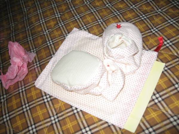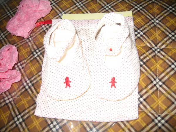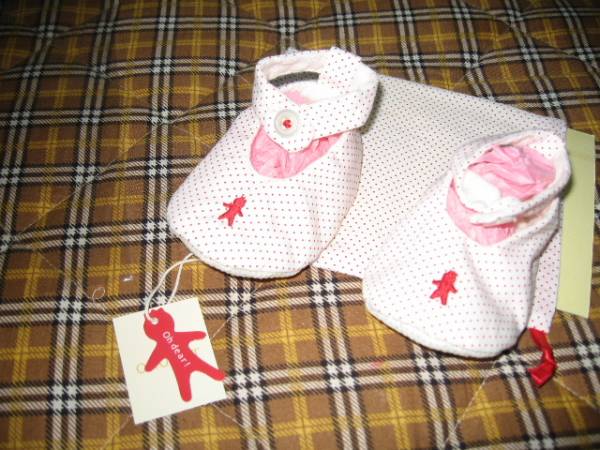 10,5cm。白に赤のピンドット柄。形は柔らかな布製のため崩れてはいますが履かせてくだされば形はきれいになります。