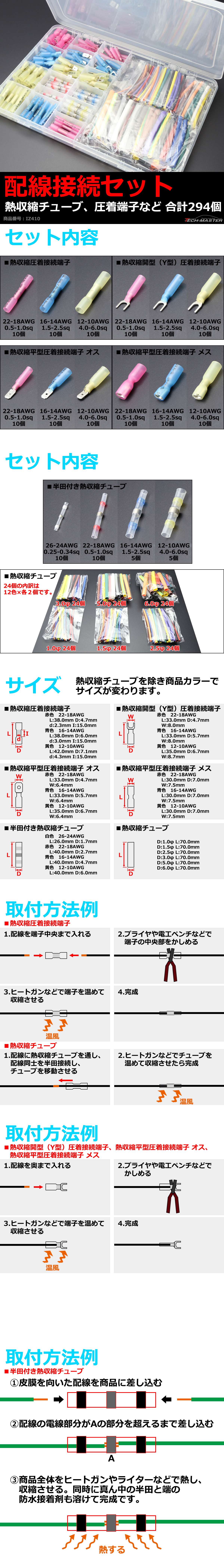 | 配線接続に便利な、熱収縮圧着接続端子、熱収縮開型(Y型)圧着接続端子、熱収縮平型圧着接続端子 オス、熱収縮平型圧着接続端子 メス、半田付き熱収縮チューブ、熱収縮チューブがセットで、合計294個入っております。 様々なサイズがセットになっており、収納ケース付きで便利です。 |
