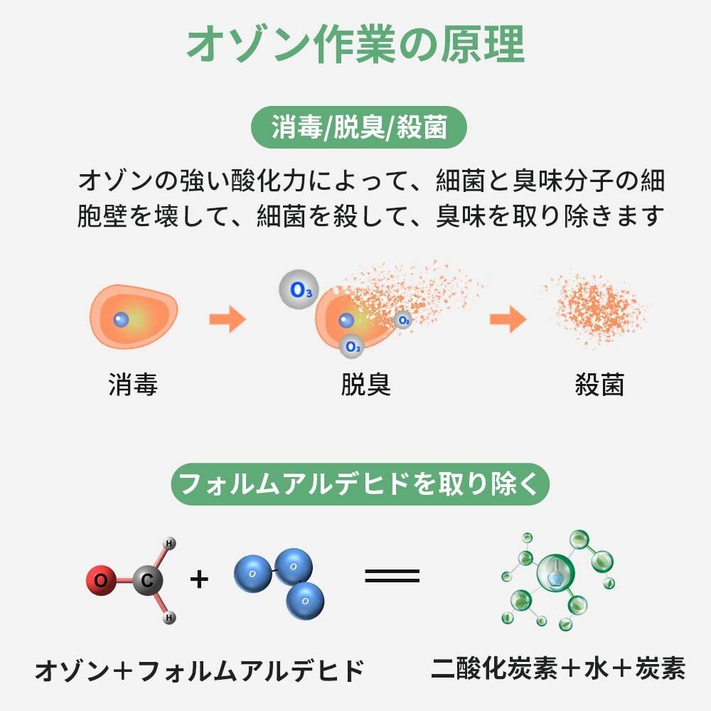 【空気浄化/鮮度保持】】脱臭だけではなく、フォルムアルデヒド、ベンゼン、アンモニア、一酸化炭素などの空気中の有害成分も分解できます。それに、浄化後の廃棄物を発生しなくて、水や酸素や二酸化炭素などの無害成分を発生します。また、オゾンは野菜などから発生するエチレンガスを分解する機能もありますので、冷蔵庫に入れたら、野菜?果物のにおい取り除くことだけではなく、鮮度も長持ちさせます。