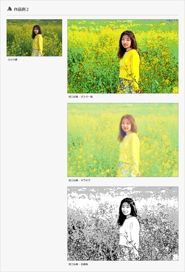 ■「似顔絵のプロ」は、写真を似顔絵風に加工できる写真編集ソフトです。 AI技術で顔を認識し、自動で加工できます。 ■こんな時におすすめ ・SNSやブログで映えるおしゃれな写真を作りたい ・プライバシー保護のために顔を少しぼかしたい ■簡単3ステップ 1.加工する写真を読み込む ドラッグ&ドロップか、「ファイルを開く」ボタンから写真を選びます。 2.調整 ポスター風、キラキラ、漫画風から3タイプの画風を選ぶことができます。 各々の画風で、輪郭線の濃さや色の濃淡を調整できます。 3.保存 加工した写真はJPEG、TIFF、PNG、BMPの形式で保存できます。 ■対応形式 入力:JPEG、TIFF、PNG、BMP 出力:JPEG、TIFF、PNG、BMP ■対応OS ・Windows 10/8.1 (32/64bit版) ■ご注意 ※ご使用にはインターネットによるライセンス認証が必要です。 ■詳しくはファンファーレ製品紹介ページまたはソースネクスト製品紹介ページをご確認ください。 |