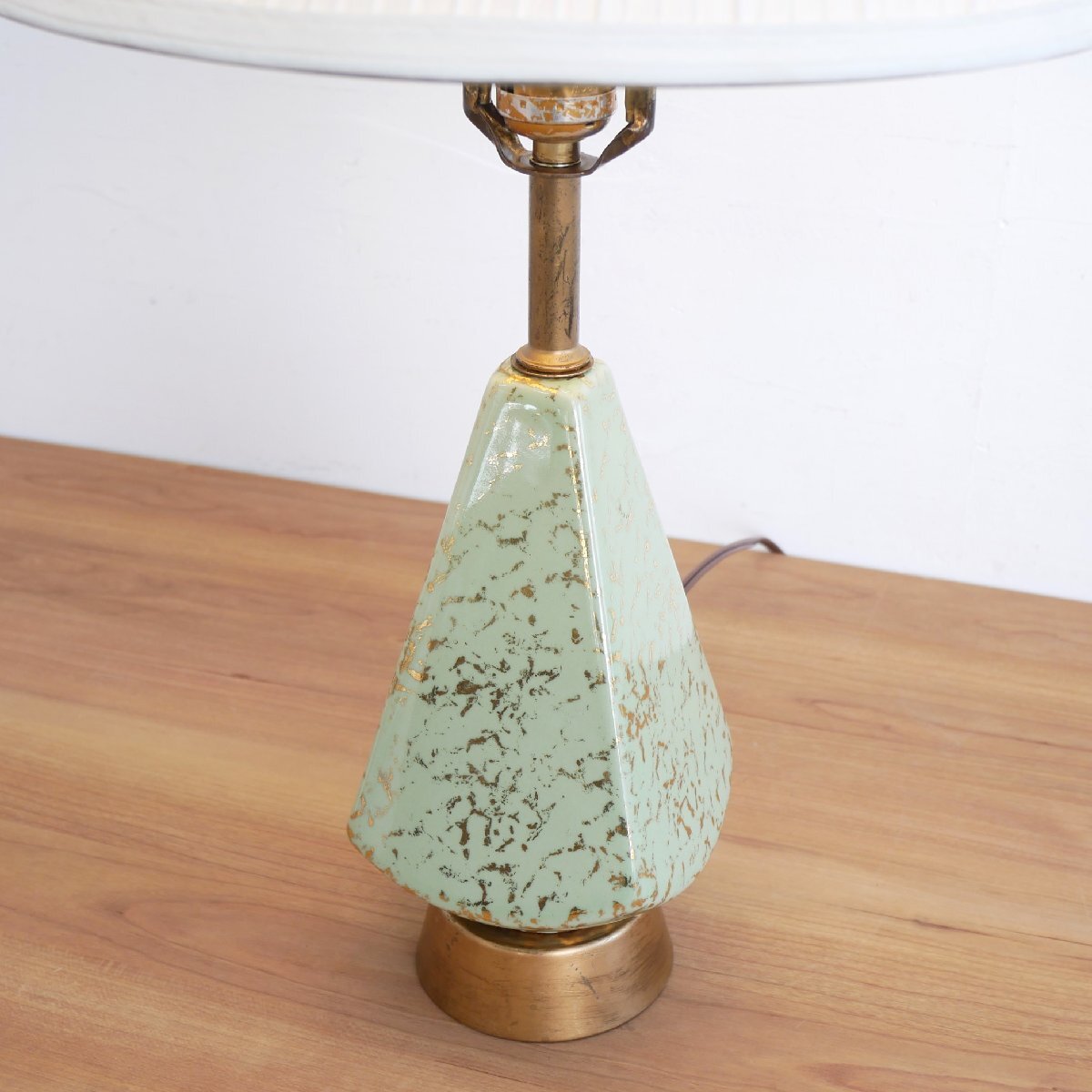 | 商品説明 explanation | ミッドセンチュリー期のテーブルランプです。 ※1950年-1960年代 本体は陶器製で、ライトグリーンにゴールドペイントが施されています。 シェードは布製で、電球は日本で市販されているLED(E26,40W相当)を使用しています。 希少なヴィンテージ照明を、お部屋のインテリアにいかがでしょうか。 |