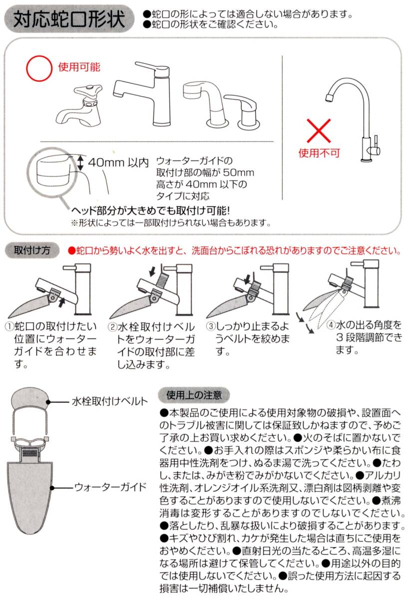 説明 水道の蛇口に手が届かないお子様の手洗いに、小さなお子様も蛇口に手が届きやすいウォーターガイド 水の出る角度を3段階に調節可能 蛇口のヘッド部分が大き目でも装着可能