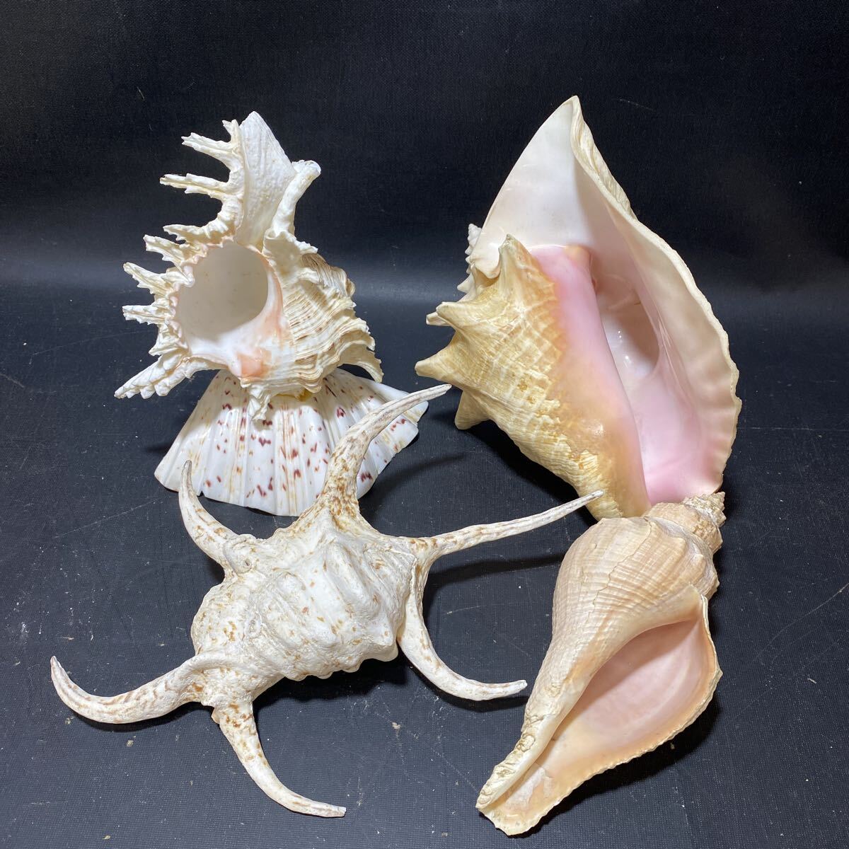 N 6724 [ 巻貝 貝殻 まとめて4点 ] コンク貝 スイジ貝 他 白系 天然貝 置物 オブジェ 海 巻き貝 水槽装飾 標本 法螺貝 ホラ貝 現状品