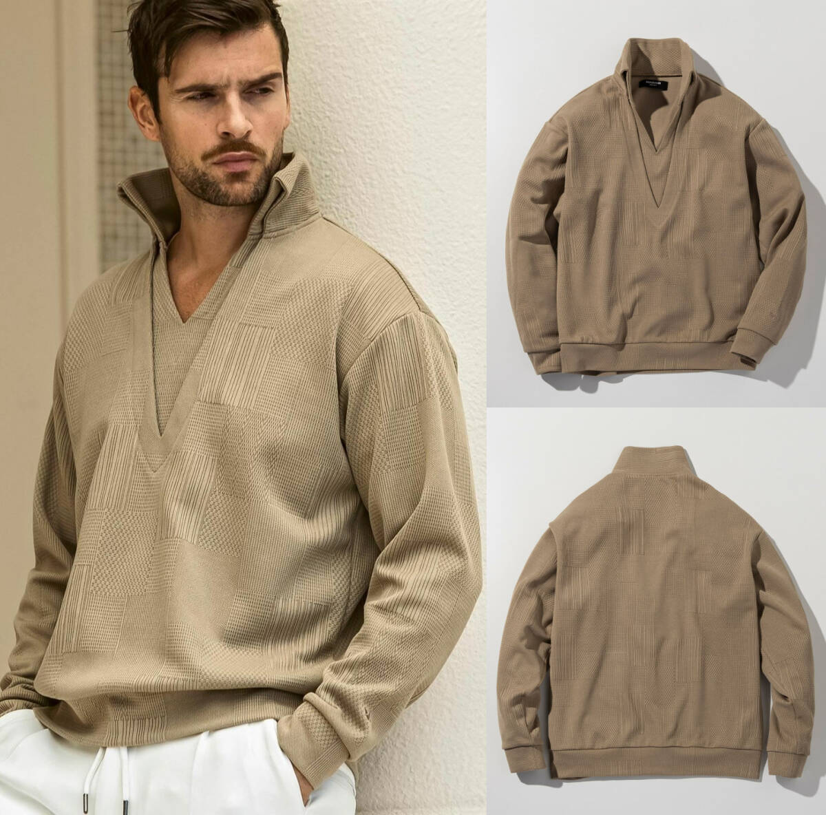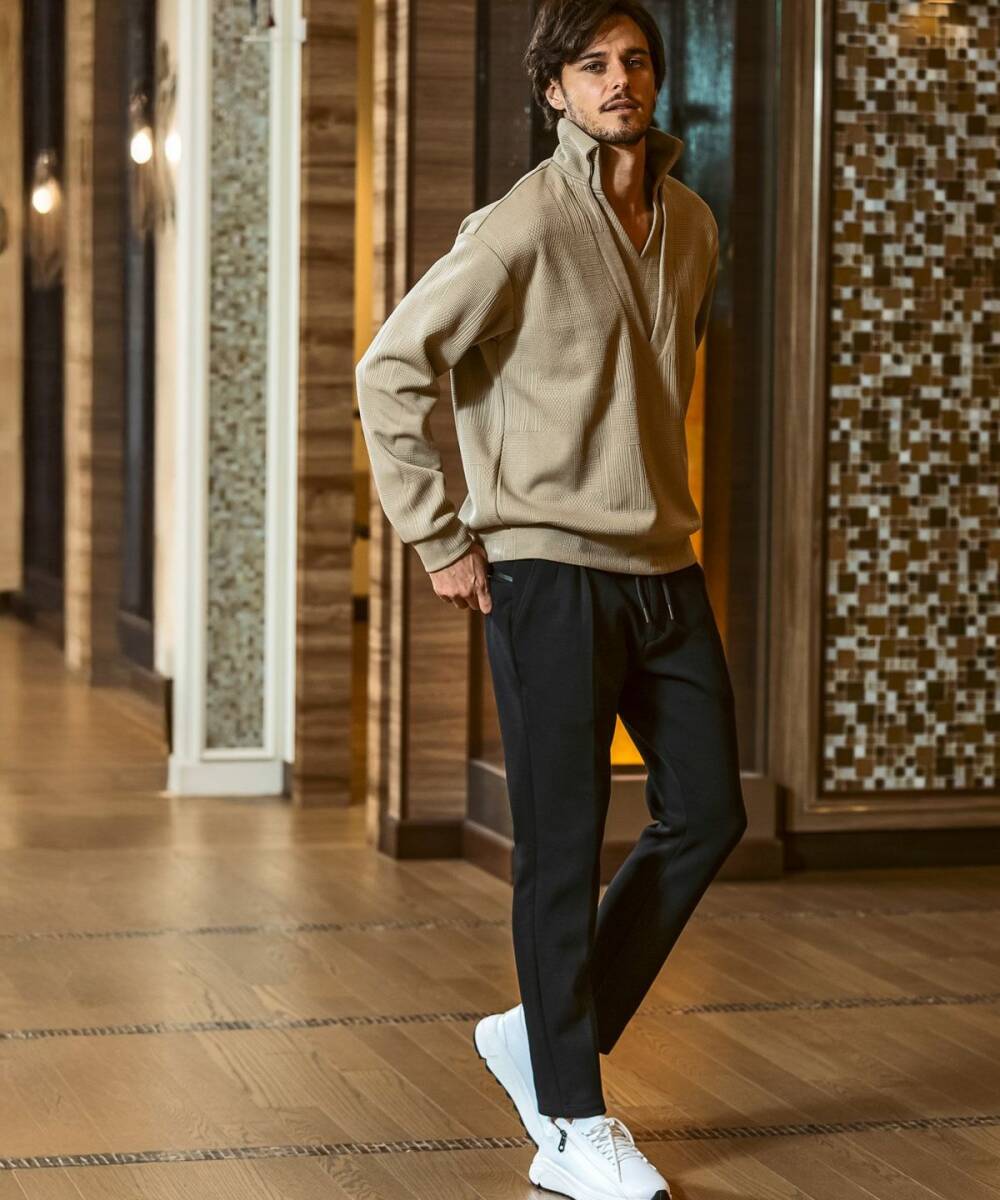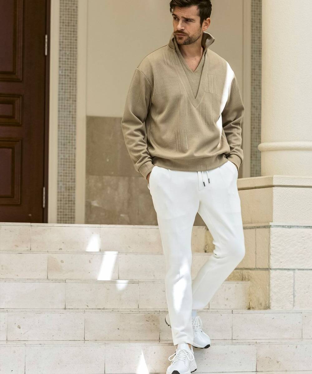 深めのVネックとレイヤード風のデザインが、洒落感と抜け感を演出。