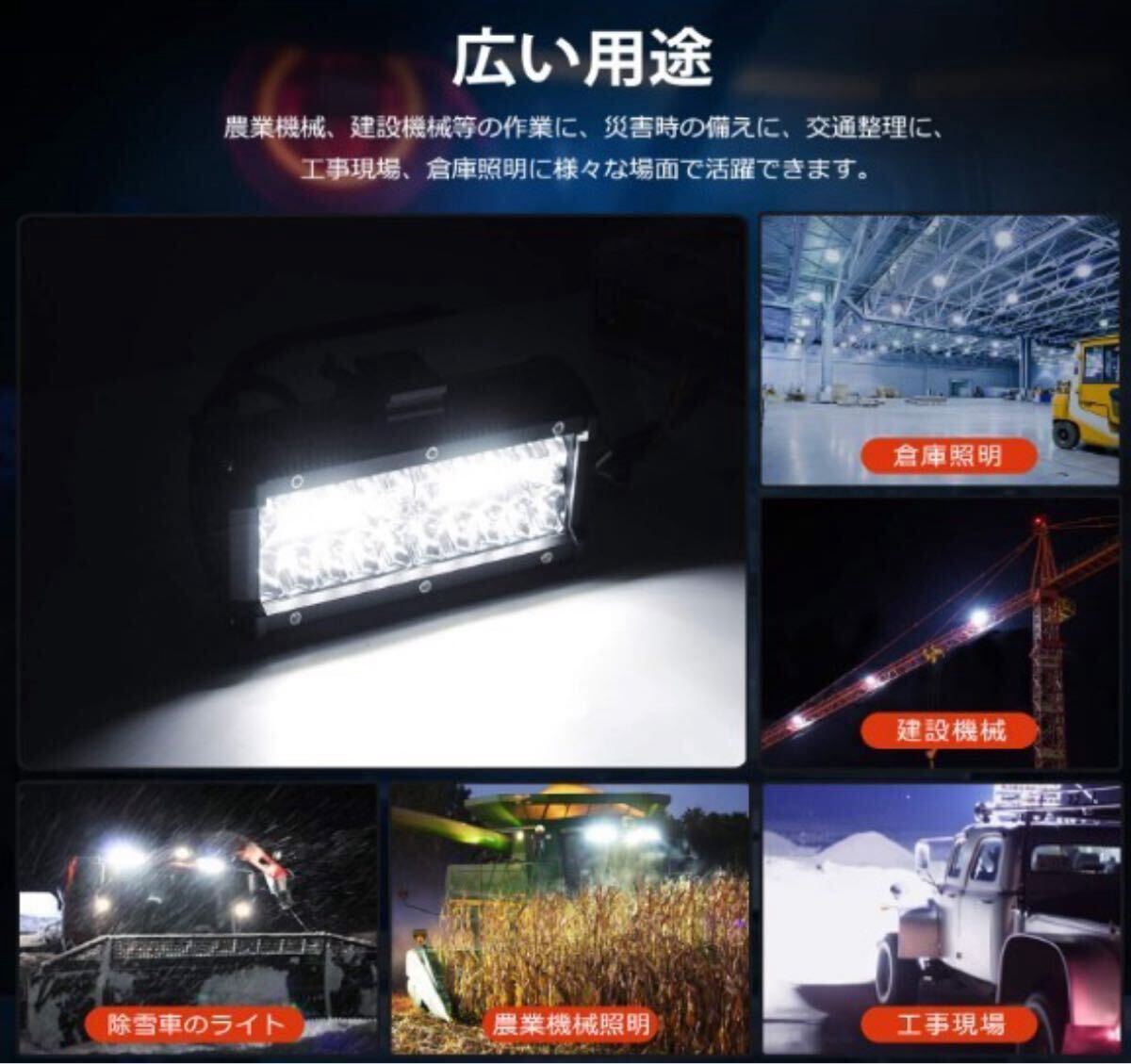 ●:フォークリフトのライト、除雪車のライト、夜釣りの照明・集魚ライト,車外灯,汎用LED作業灯、シラス漁の常夜灯、海苔漁の常夜灯、トラックの荷台用の照明、農業機械、建設機械等の作業に、災害時の備えに、交通整理に、工事現場、 車外灯、倉庫照明に様々な場面で活躍できます!
