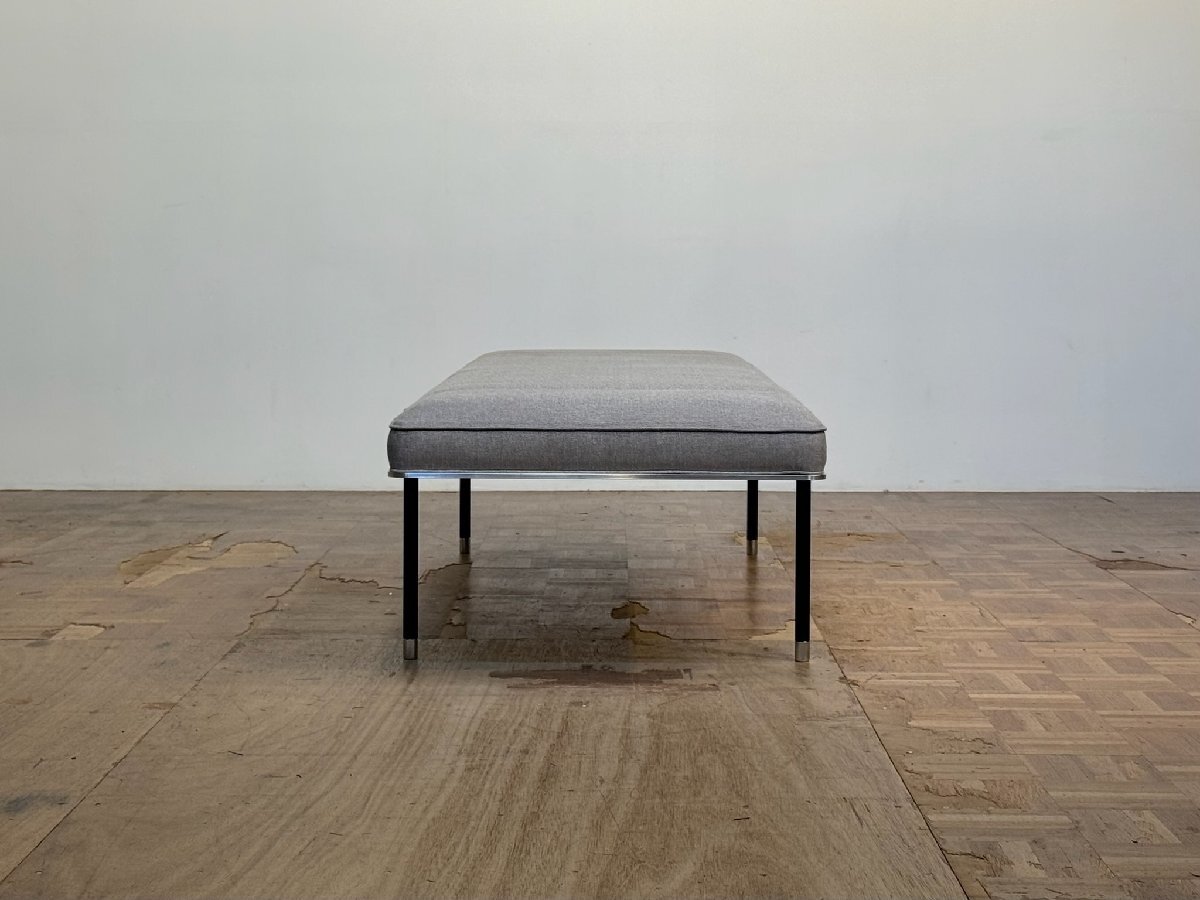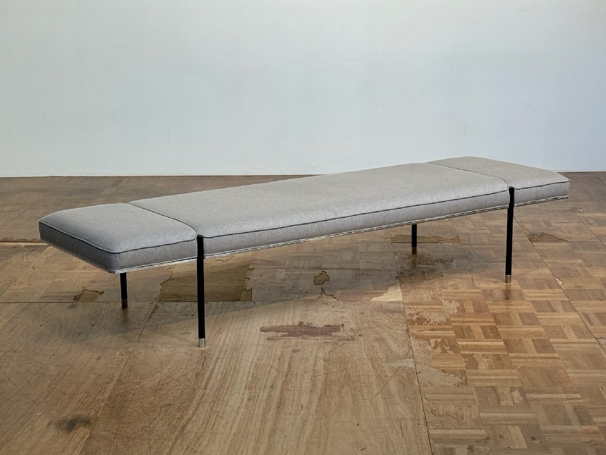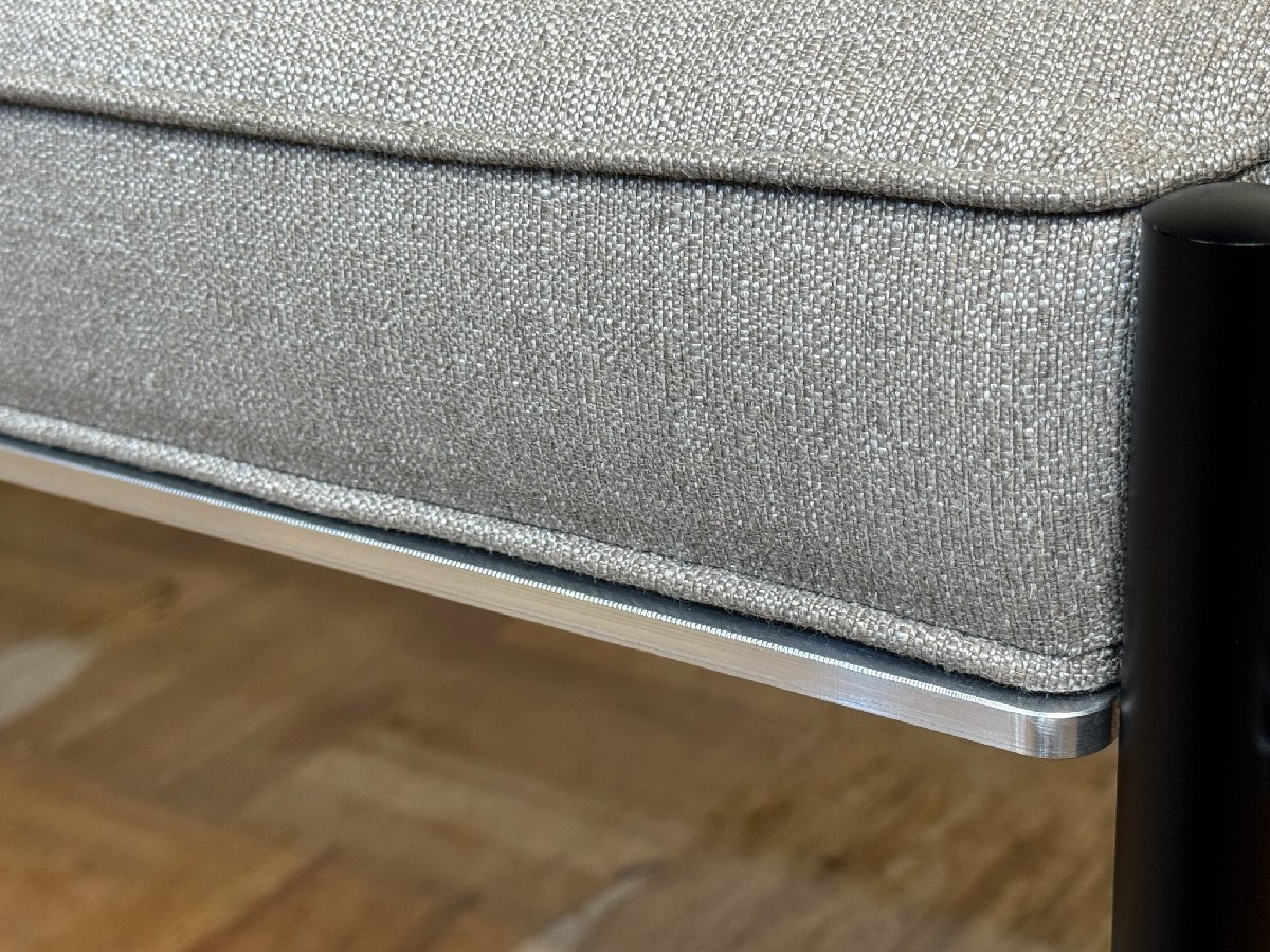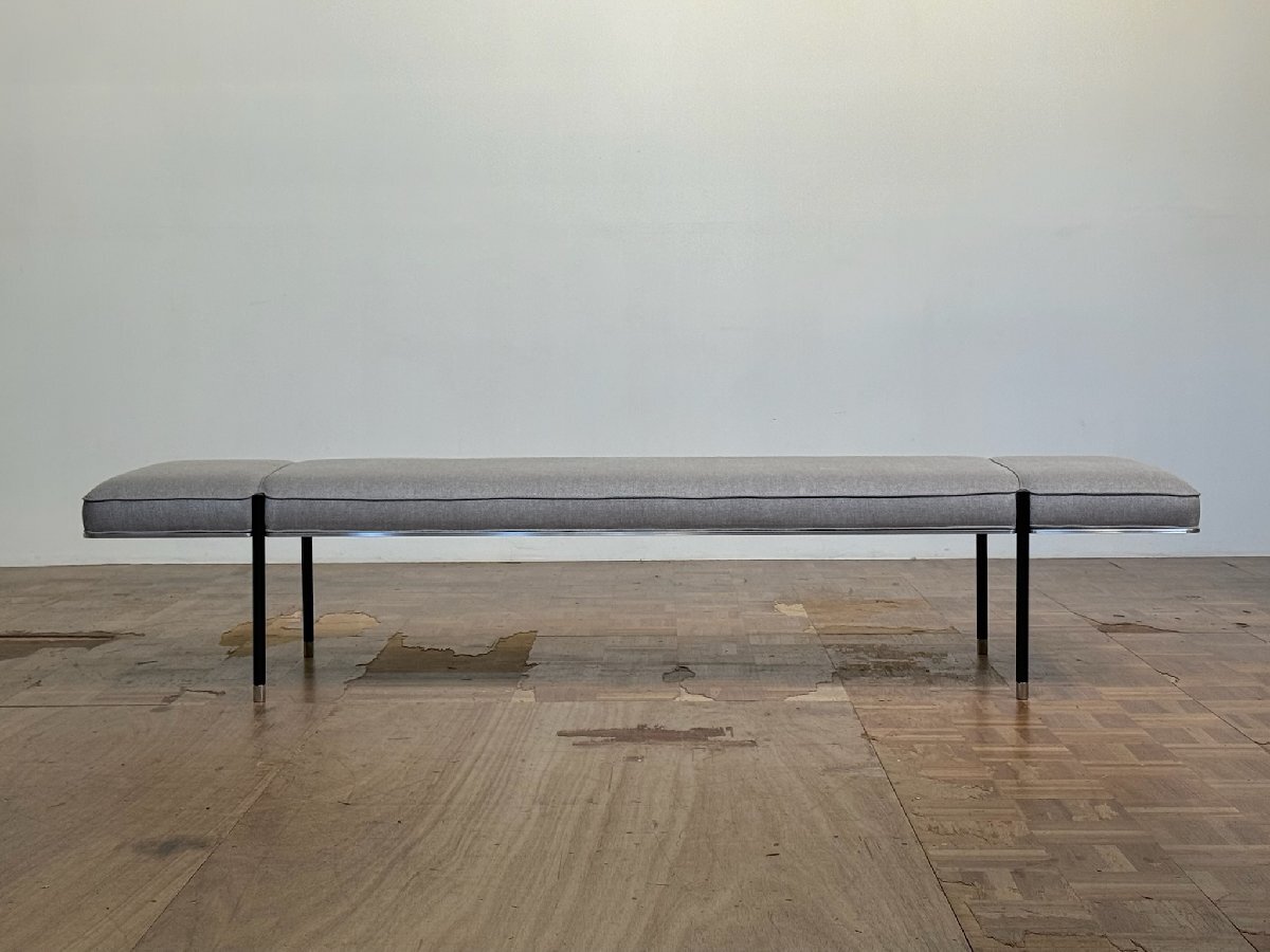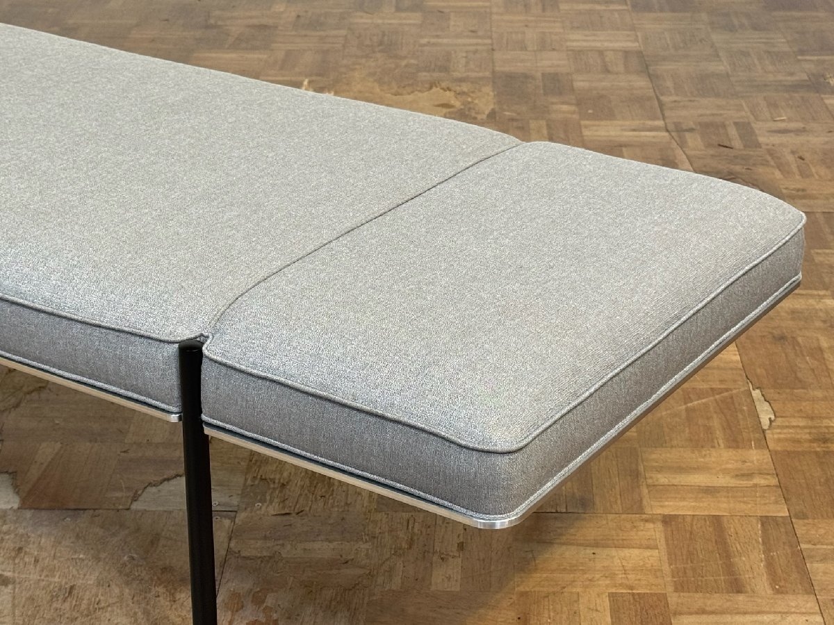 幕板なしに2000mmを超える超ロングサイズのうっすらとしたフレームを軽やかで無機質な最低限な装飾をまとったポールレッグスで橋渡しする、内部構造に高性能アルミ製のハニカム構造を仕込むことで極限レベルのスリムさ軽量性を実現した、クッション下部のアルミニウムの光沢のファッショナブルな、ブランドを代表す大セラーソファベンチ。Cassina ixc. / e interiors より。