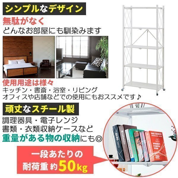 収納ラック 棚 金属シェルフ スチールラック メタルラック 折りたたみ 折り畳み スチール棚 キャスター付 組立簡単 頑丈 ホワイト 白 5段
