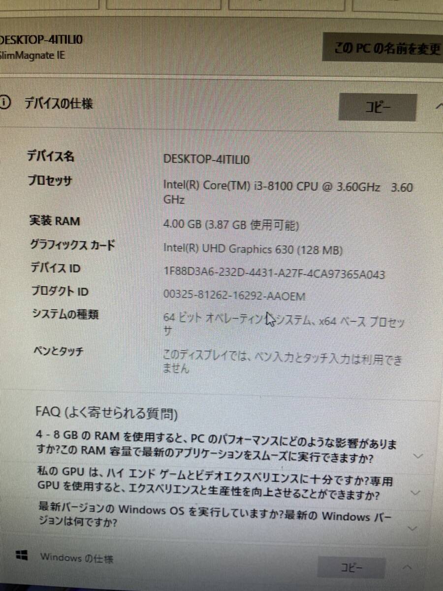 | ◆◇【Win10インストール済】 Intel Core i3-8100CPU @ 3.60GHz◇◆ | ||