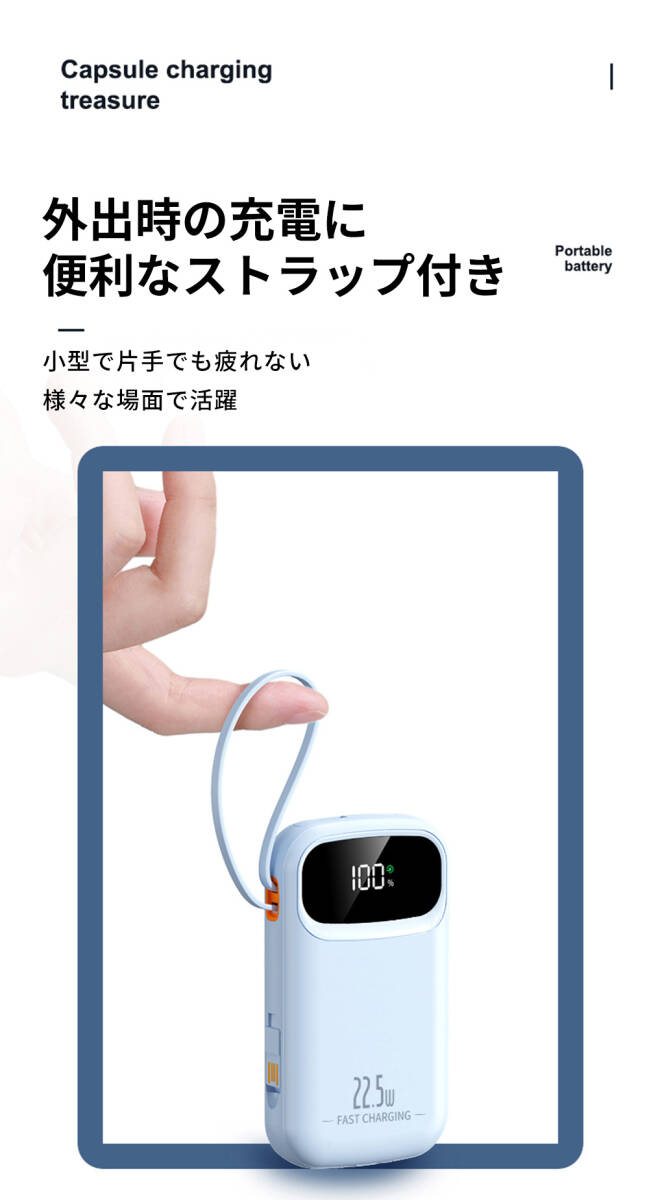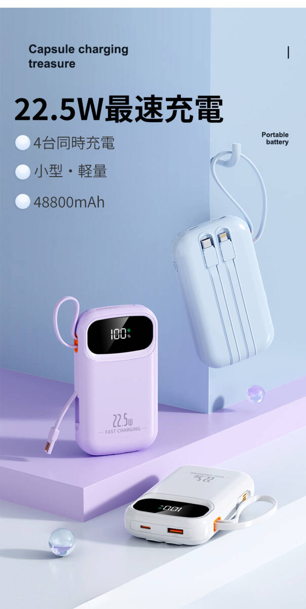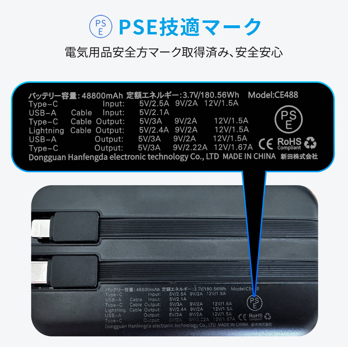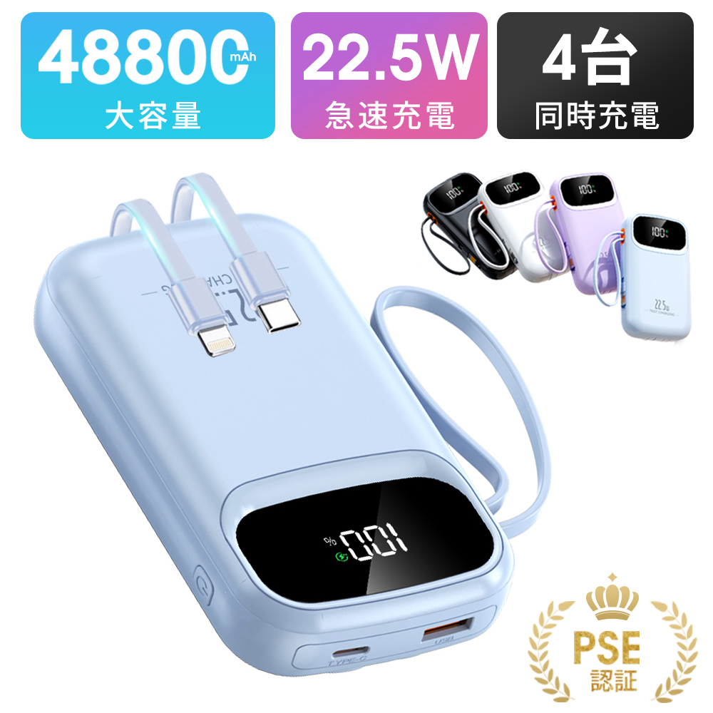 | 48800mAhのモバイルバッテリーは、スマホと重ねて持っても負担にならないほどコンパクトなのが魅力です。48800mAhの超大容量により、iOS、Androidのスマホとタブレットはもちろん、イヤホン、ゲーム機などにも数回に充電できます。 【Micro-usb/Type-c 2Way入力・Smart IC充電】 入力はUSB-CとLightningの2つ選択肢があり、お持ち運びが便利になります。入力は最大2.1A急速充電可能、1度の充電で数日使用も可能、旅行やキャンプに安心感が違います。効率的な充電を行う「低電流モード」を備え、Bluetoothイヤホンやスマートウォッチなど小型の機器も充電可能です。 【2.4A急速充電対応・2ポート同時充電可能】 出力には二つUSB-A ポートから2台同時に充電可能です。独自のスマート機能によりデバイスを自動で判別し、最適な出力で急速充電を行います。出力は最大2.4A急速充電可能ですから、素早く蓄電可能、より長持ちで旅先やちょっとした外出、出張の際の強い味方に最適。 【電池残量が一目瞭然!安全保護機能搭載】 本体にLED残量表示ランプを搭載しており、電池残量が一目で確認できます。使うときにバッテリーの残量が無いといった不安を解消します。高性能ICチップと安全装置搭載、バッテリーが過充電・過放電・過熱・ショートの際に、自動的に電流を遮断して充電停止になるので、安心して使用できます。本モバイルバッテリーはPSEマーク取得済、安心*安全にご使用いただけます。 |