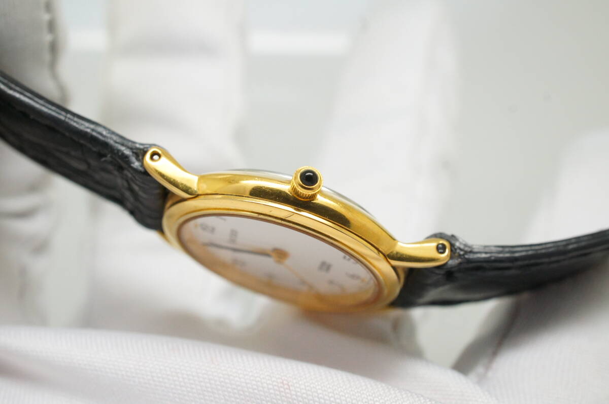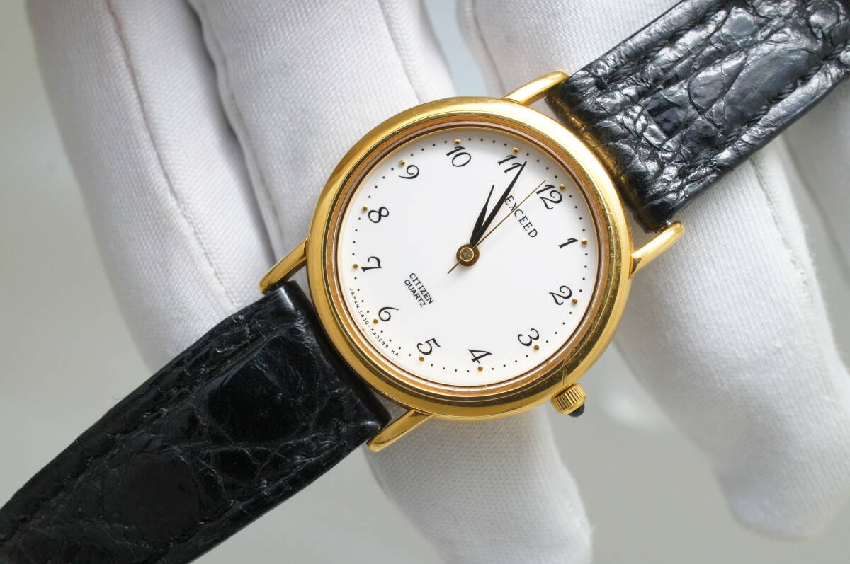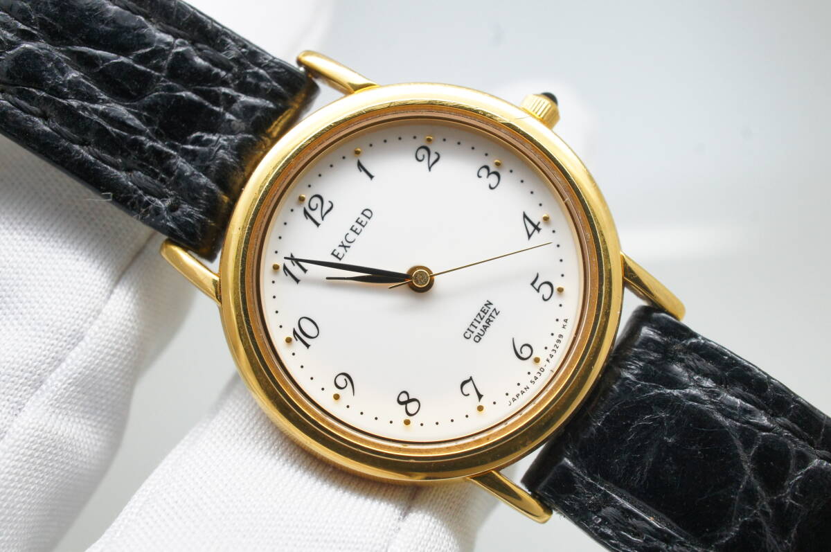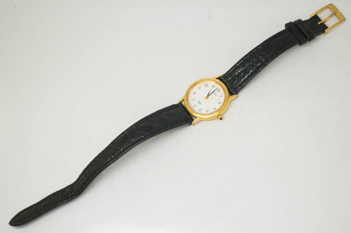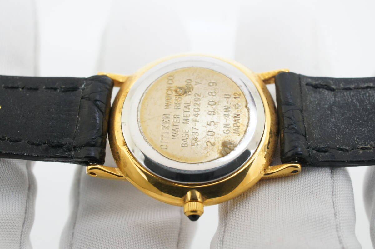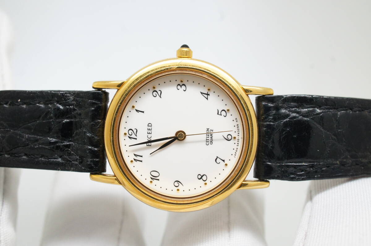 J78●作動良好 CITIZEN シチズン EXCEED エクシード 5437-F40292 白文字盤 ラウンド型 レディース腕時計 ゴールド金×黒ベルト クォーツ