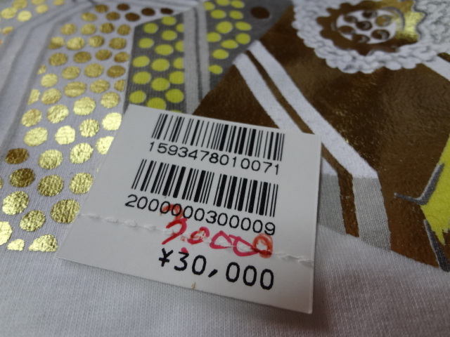 30,000円という値札が洋服のあいだに入っていました。確かこのくらいの価格だったと記憶しているので、このTシャツのものだと思います。
