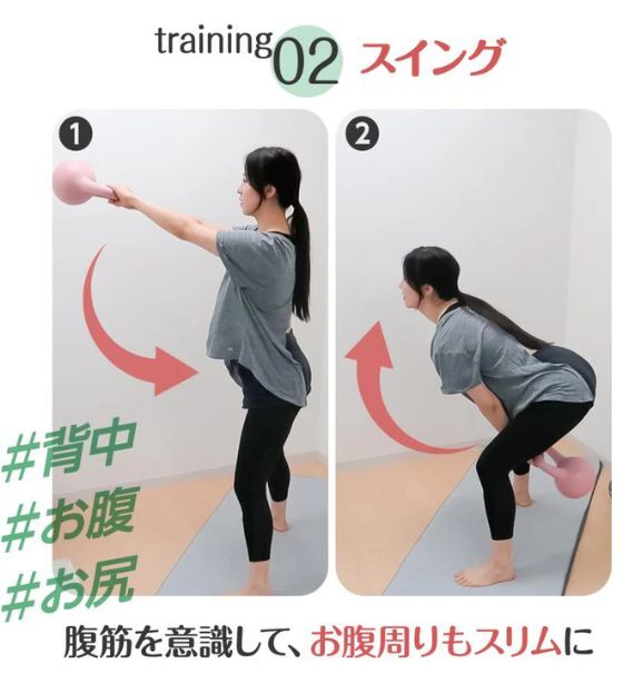 ケトルベルスイング:腹筋・背中・お尻に効いて脂肪燃焼。