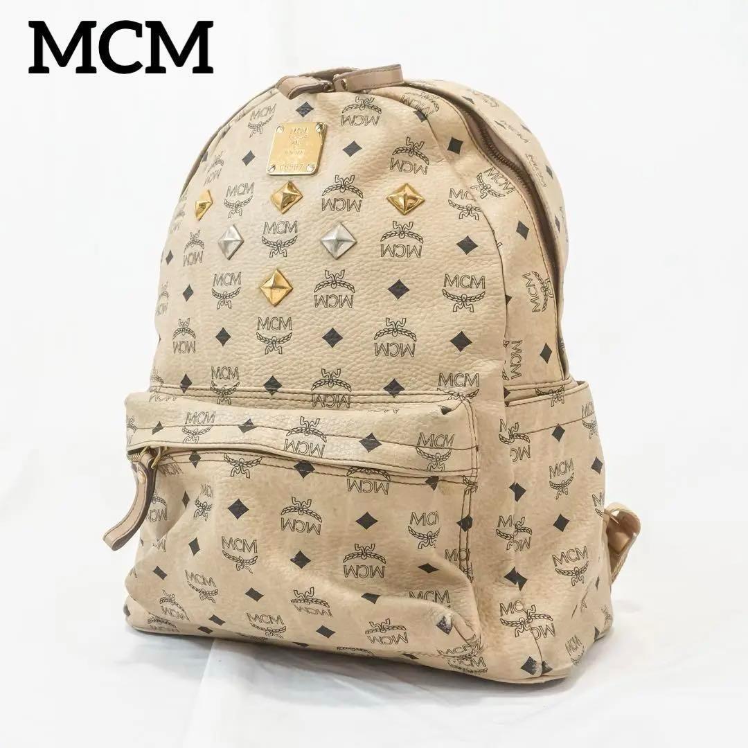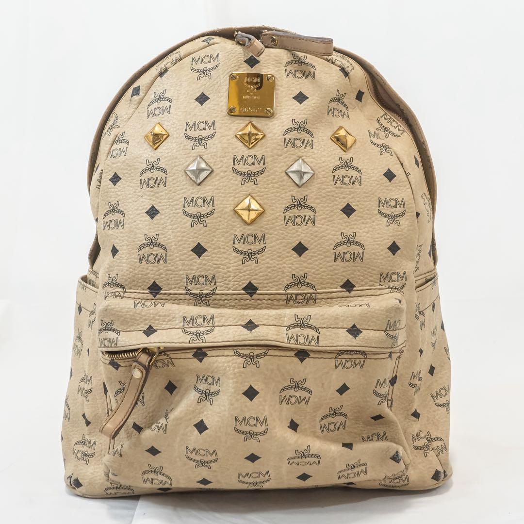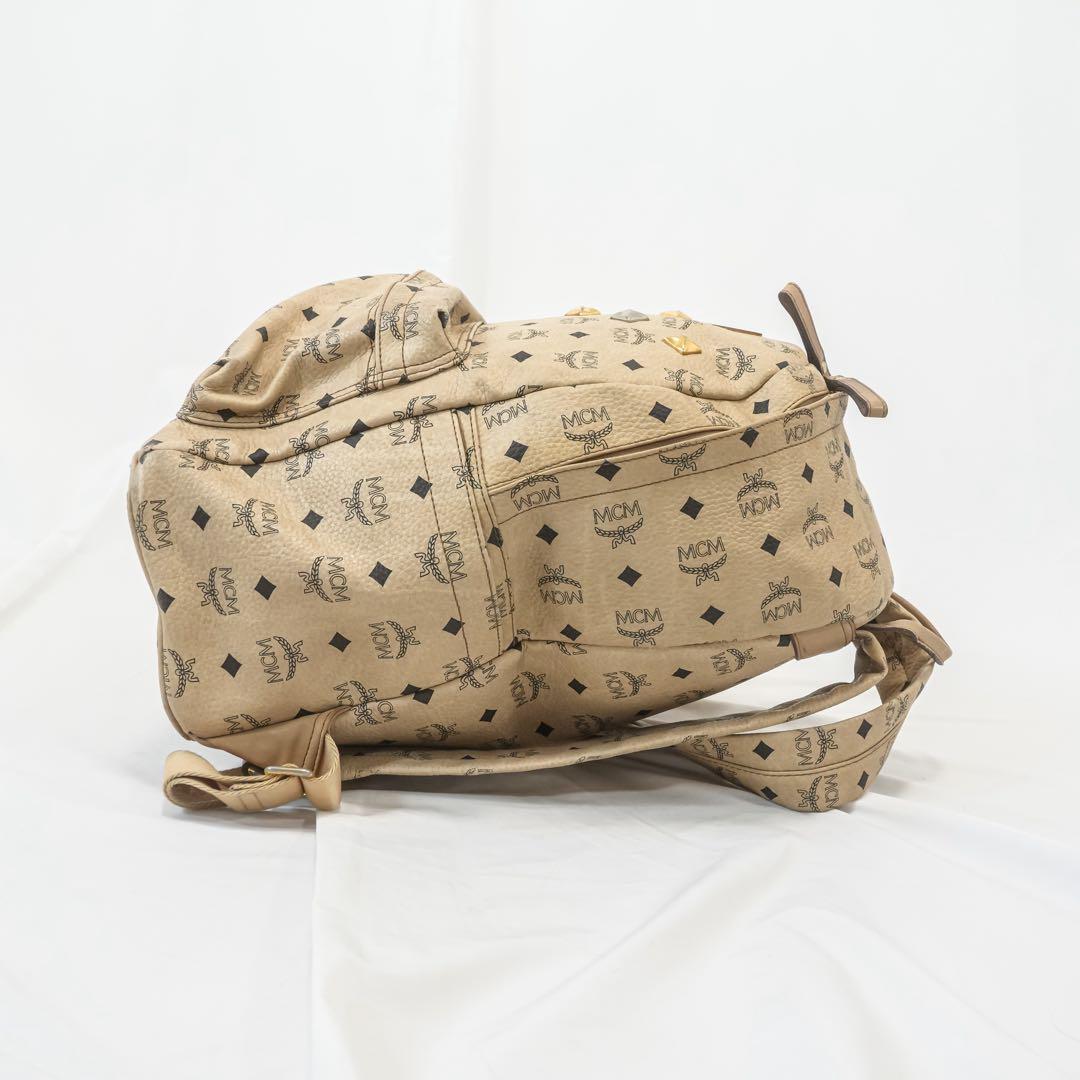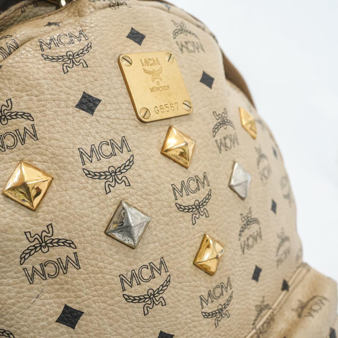 MCM のアイコニックな総柄デザインに、ゴールド&シルバーのスタッズをあしらったリュックサック。