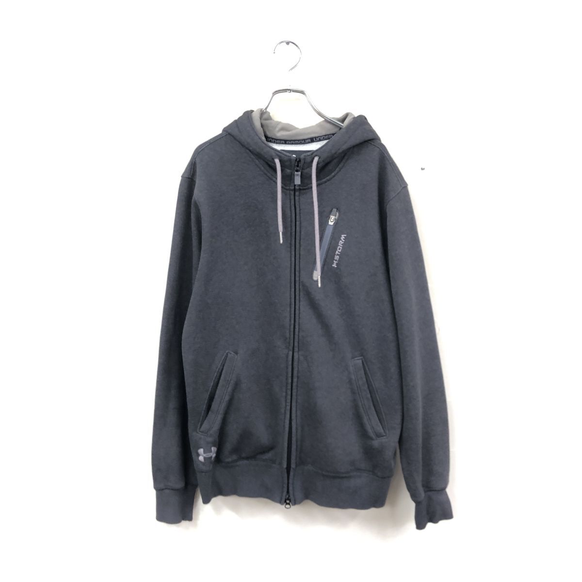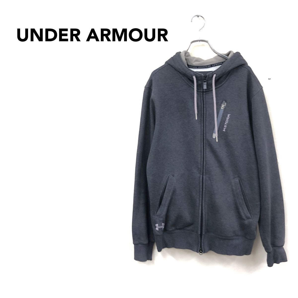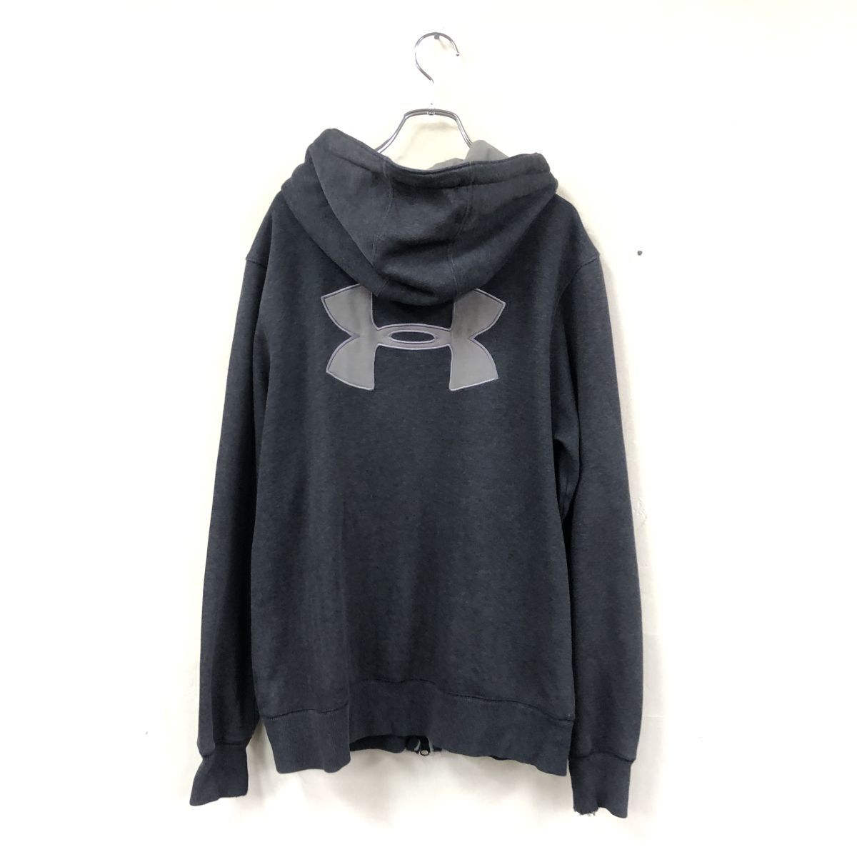 2N3119-O◆UNDER ARMOUR アンダーアーマー フルジップパーカー フーディ フード紐 刺繍ロゴ◆sizeL グレー コットン ポリエステル