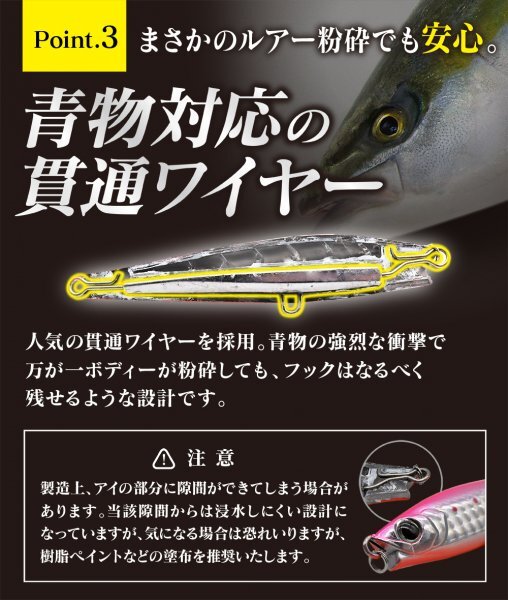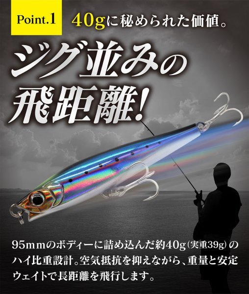 95mmのボディーに詰め込んだ40gのハイ比重設計。/空気抵抗を抑えながら、ハイ比重で長距離飛行。