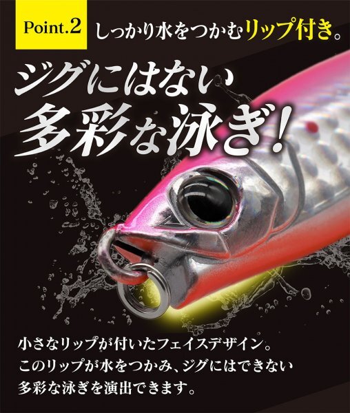 小さなリップが水をつかみ、ジグには出来ない多彩な動きが演出できます。