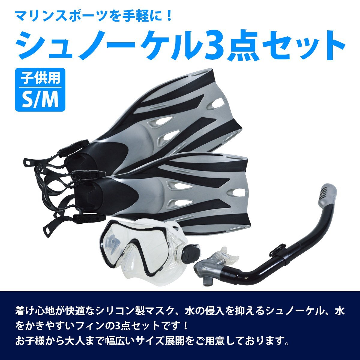 シュノーケルセット 子供用 S/Mサイズ 18cm-20.5cm シュノーケル フィン スノーケリングセット 水中ゴーグル ヒレ ブラック 黒