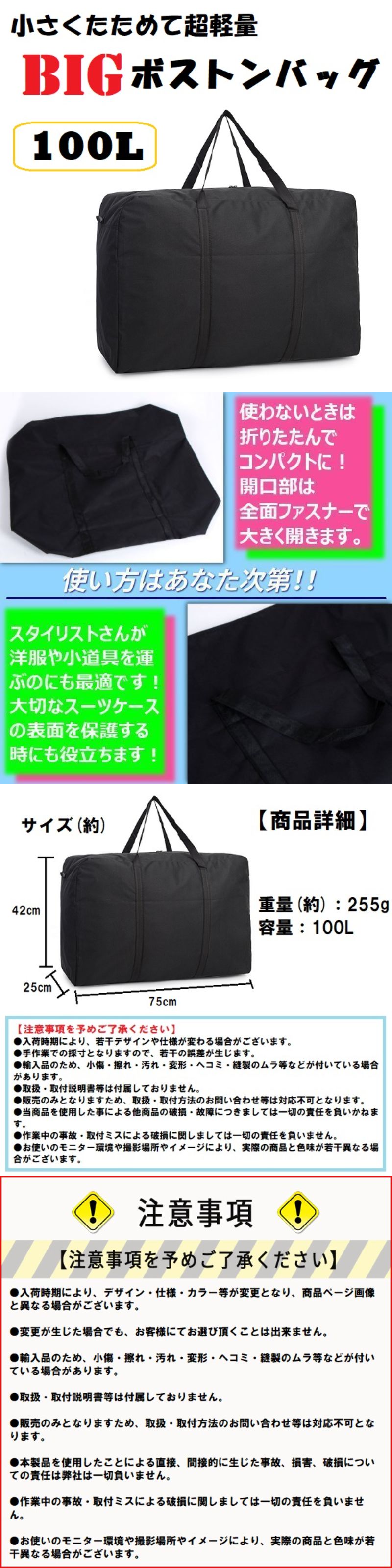 スタイリスト バッグ ボストンバッグ 100L 大容量 エコバッグ 大きいバッグ 防水 撥水 旅行 アウトドア キャンプ イベント キャリーバッグ