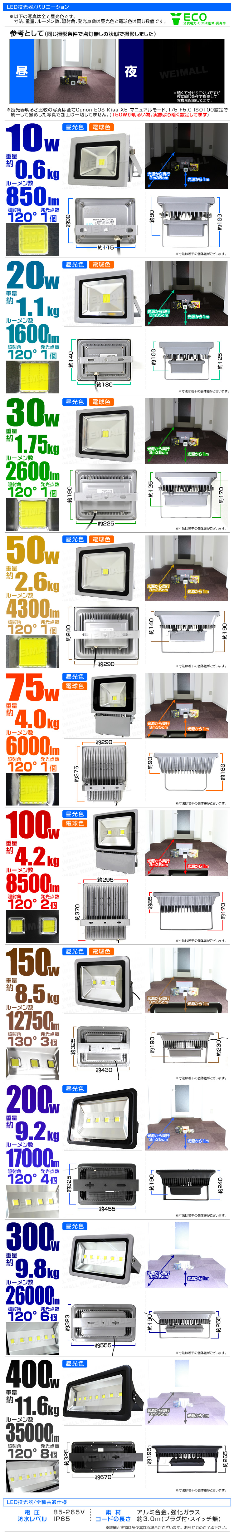 | [ アルミ+スチール合金製 LED投光器 ラインナップ ] | |||