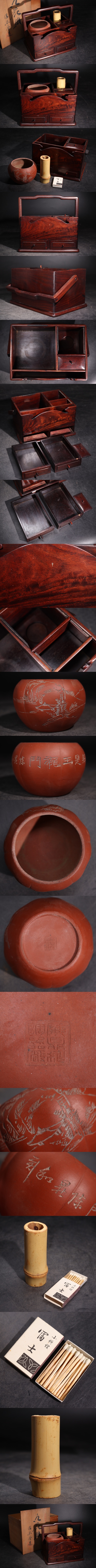 | 時代 唐木 莨盆 ・ 朱泥 陳鼎和陶器廠 底款 火入・ 竹製 灰吹 合箱 / 喫煙具 検索: 花梨 紫檀 .G3572 |