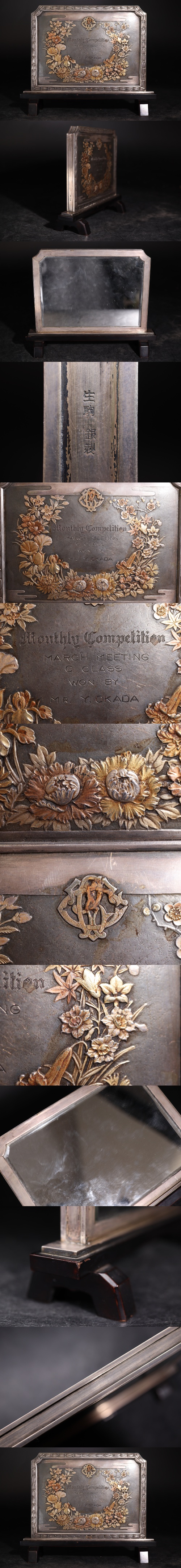 | 銀 印刻 生駒 花紋 硯 鏡 高約15.5cm・総重量約427.8g / 銀 彫金 置物 .G3593 |