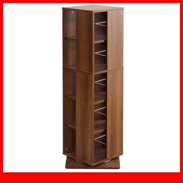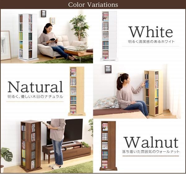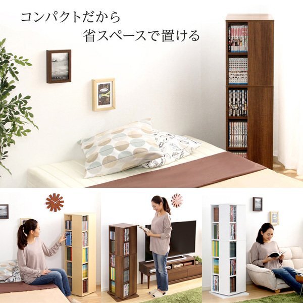 | 【ポイント】 くるくる回る回転式なので探しやすい! コンパクト設計だから省スペースにおけます。 本やDVDが約200冊収納できる大容量です。 カラーはインテリアに馴染む3色がございます。 |