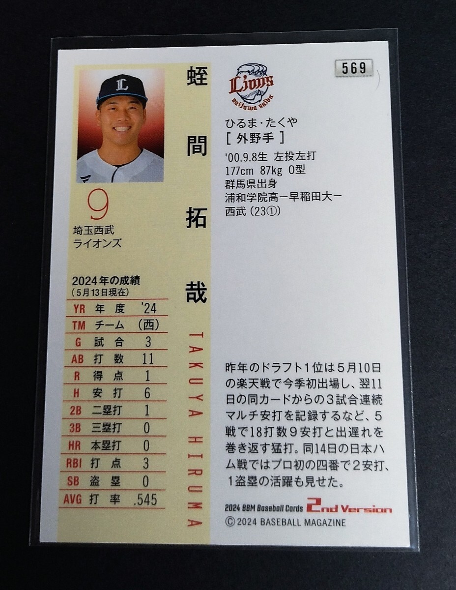 2024年BBM 2nd 蛭間拓哉(西武)銀箔サイン入り。No,569。