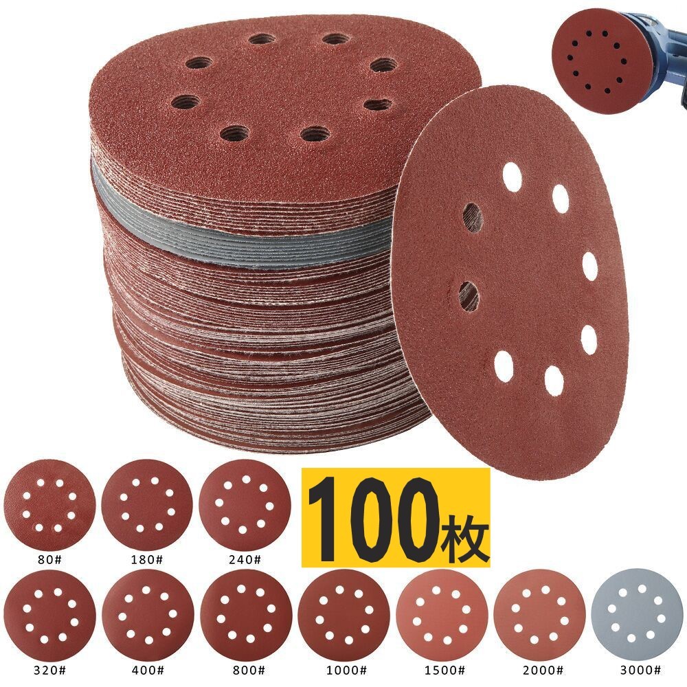 ディスク サンド ペーパー ランダムサンダー 紙やすり 研磨 研削 加工 10種100枚 マジックテープ脱着式 グラインダー DIY 集塵 8穴 D125mm