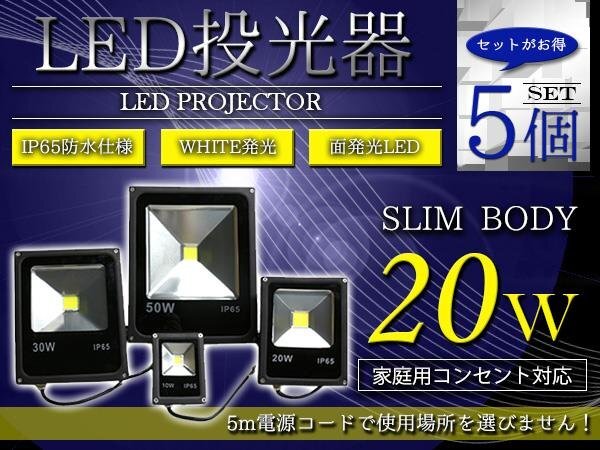 『NEW薄型スリム』 防水IP65 アルミ製 LED 投光器 20W AC100V 電源コード 5m 5個セット ホワイト 白発光 作業灯 倉庫 駐車場 照明